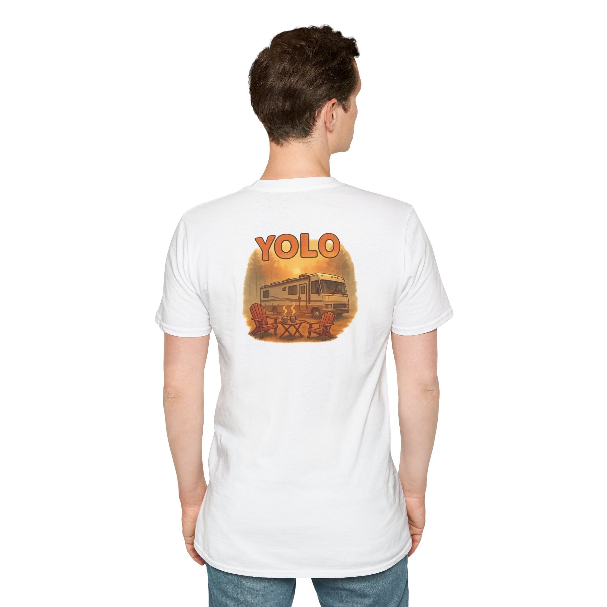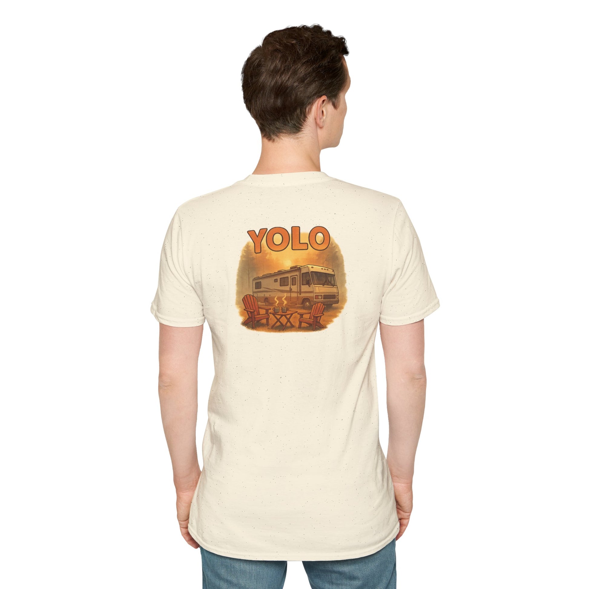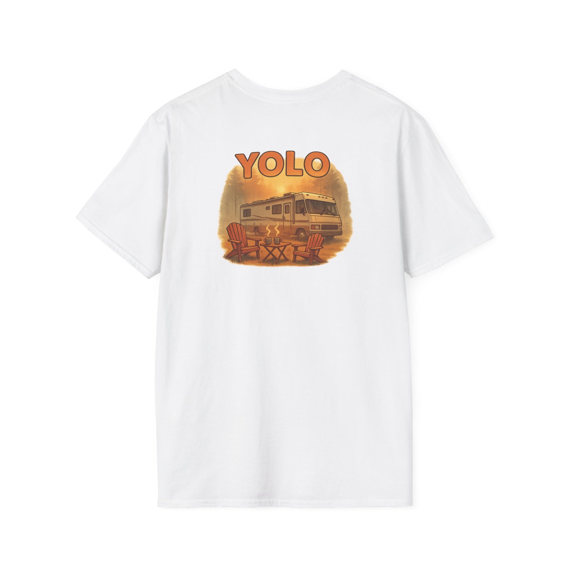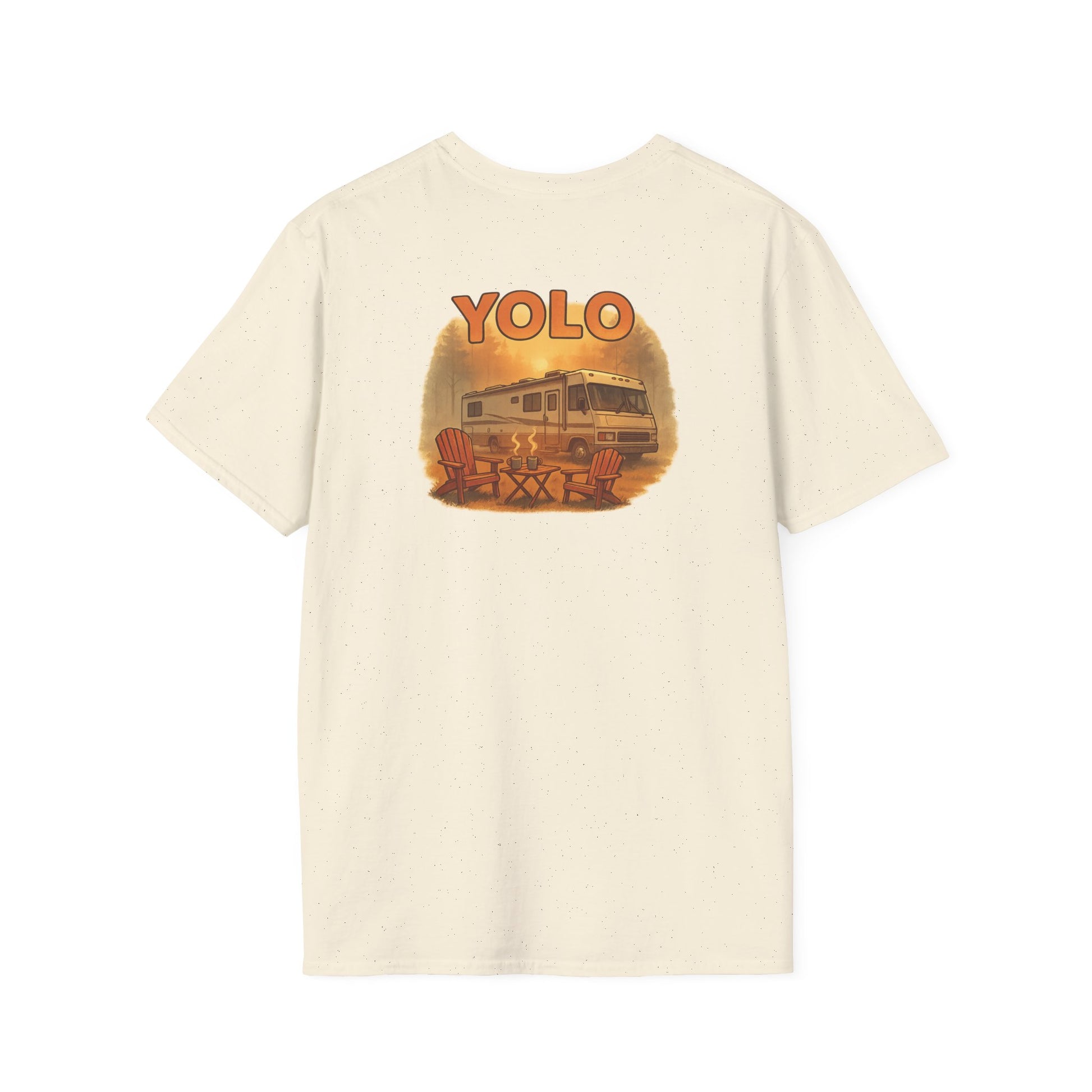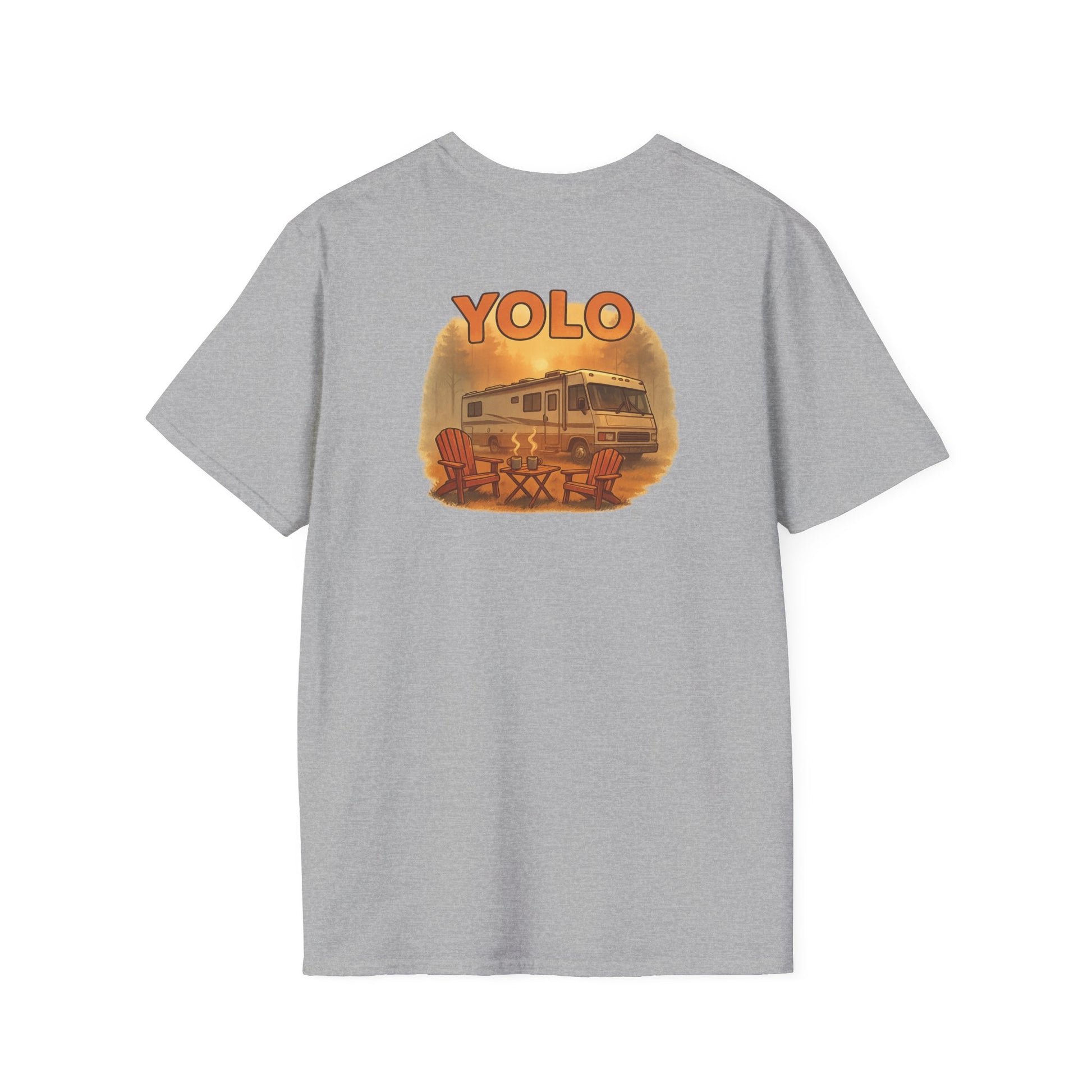 On the back, the bold YOLO lettering hovers over a perfectly chill campsite scene—because who needs a midlife crisis when you have hookups and a view? On the front? A classic RV Park sign logo, understated but knowing, for those who live (and lounge) the RV dream.
