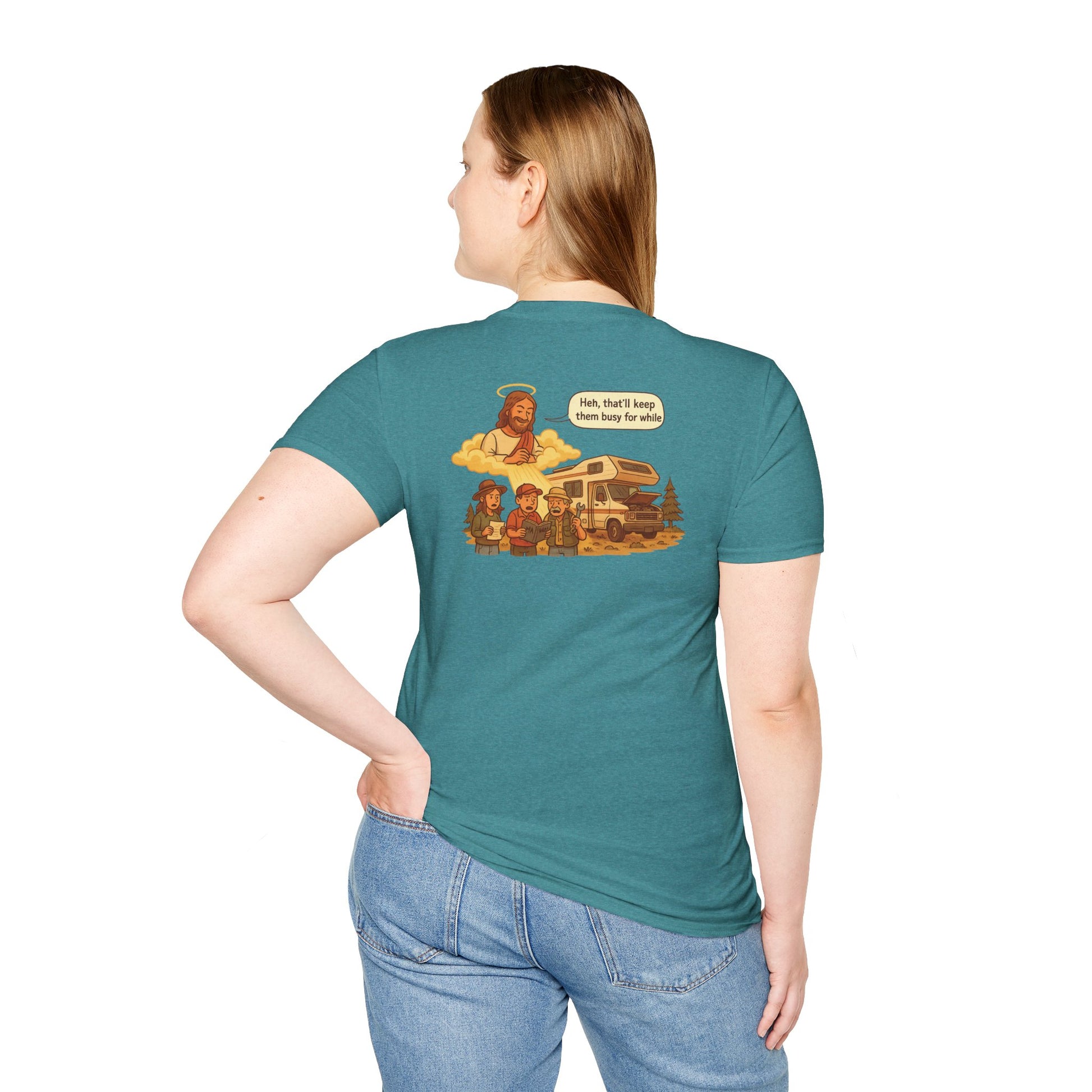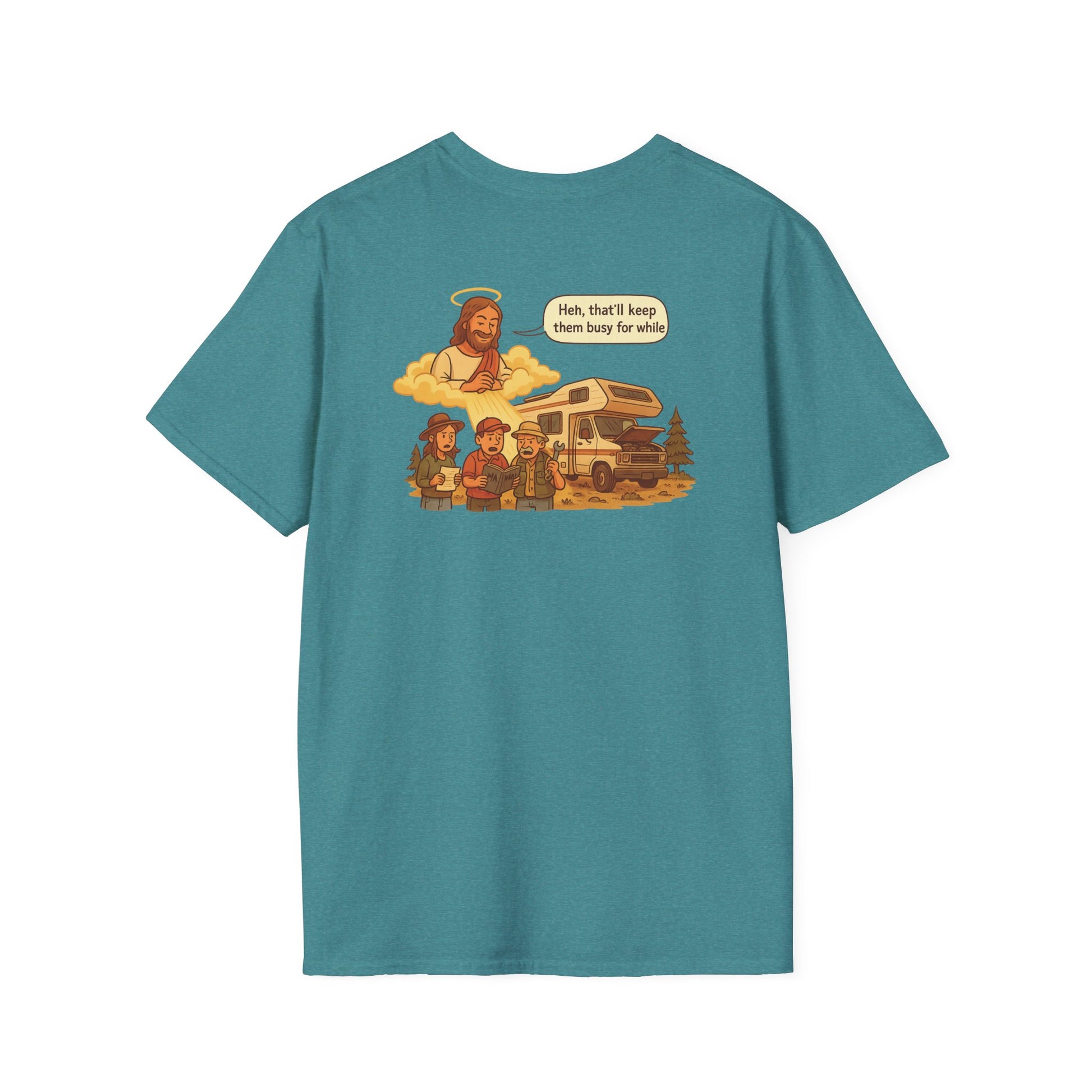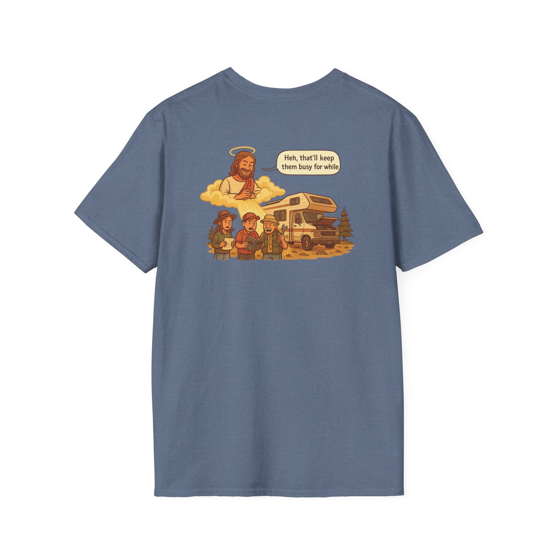 With a heavenly cameo from the ultimate overseer and your trusty RV breaking down below, this shirt says what we’re all thinking: “Heh, that’ll keep them busy for a while.”