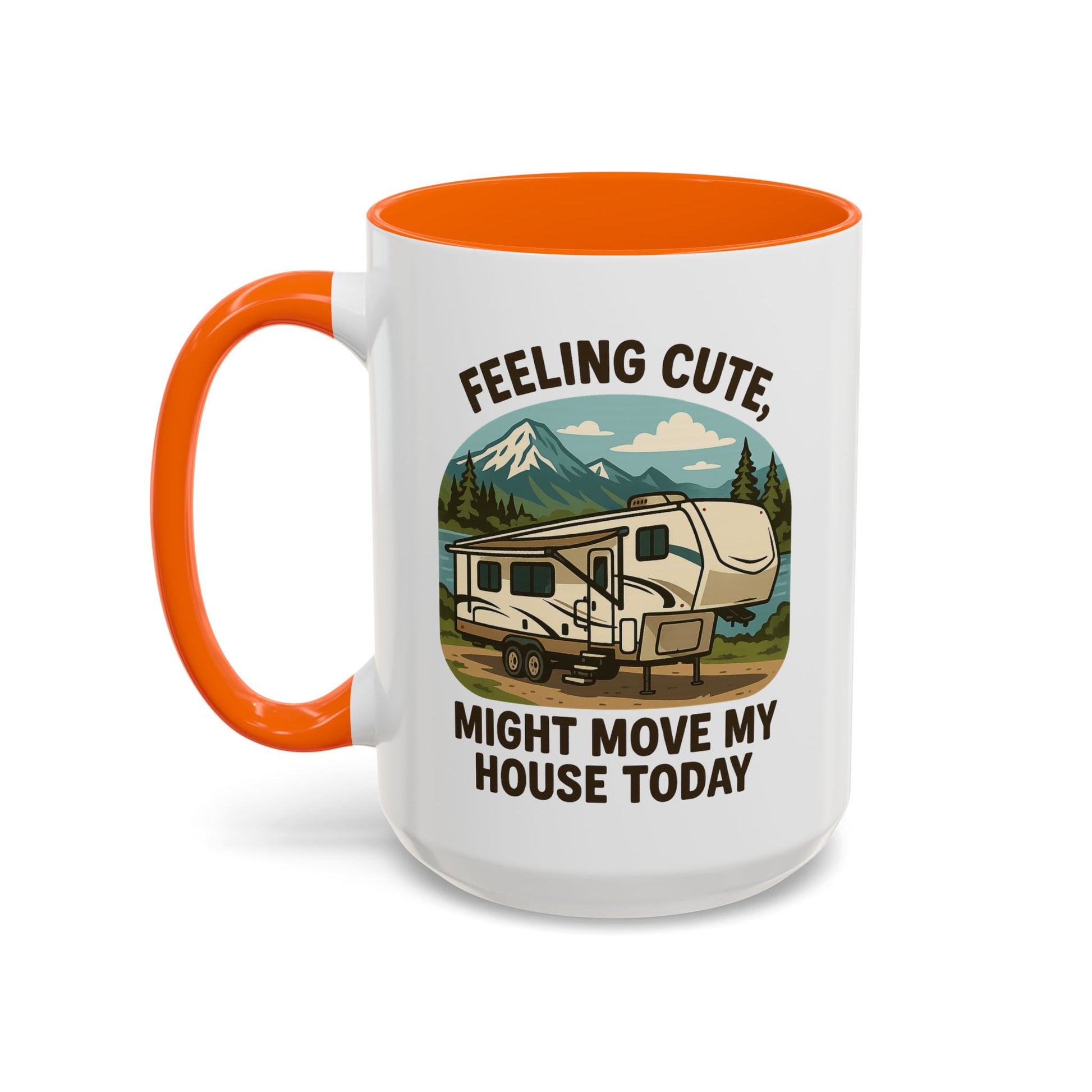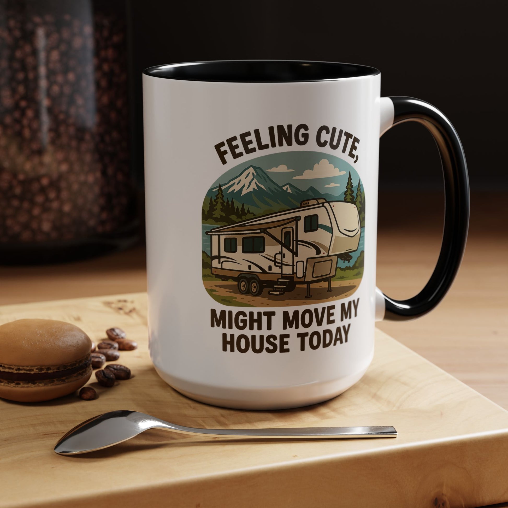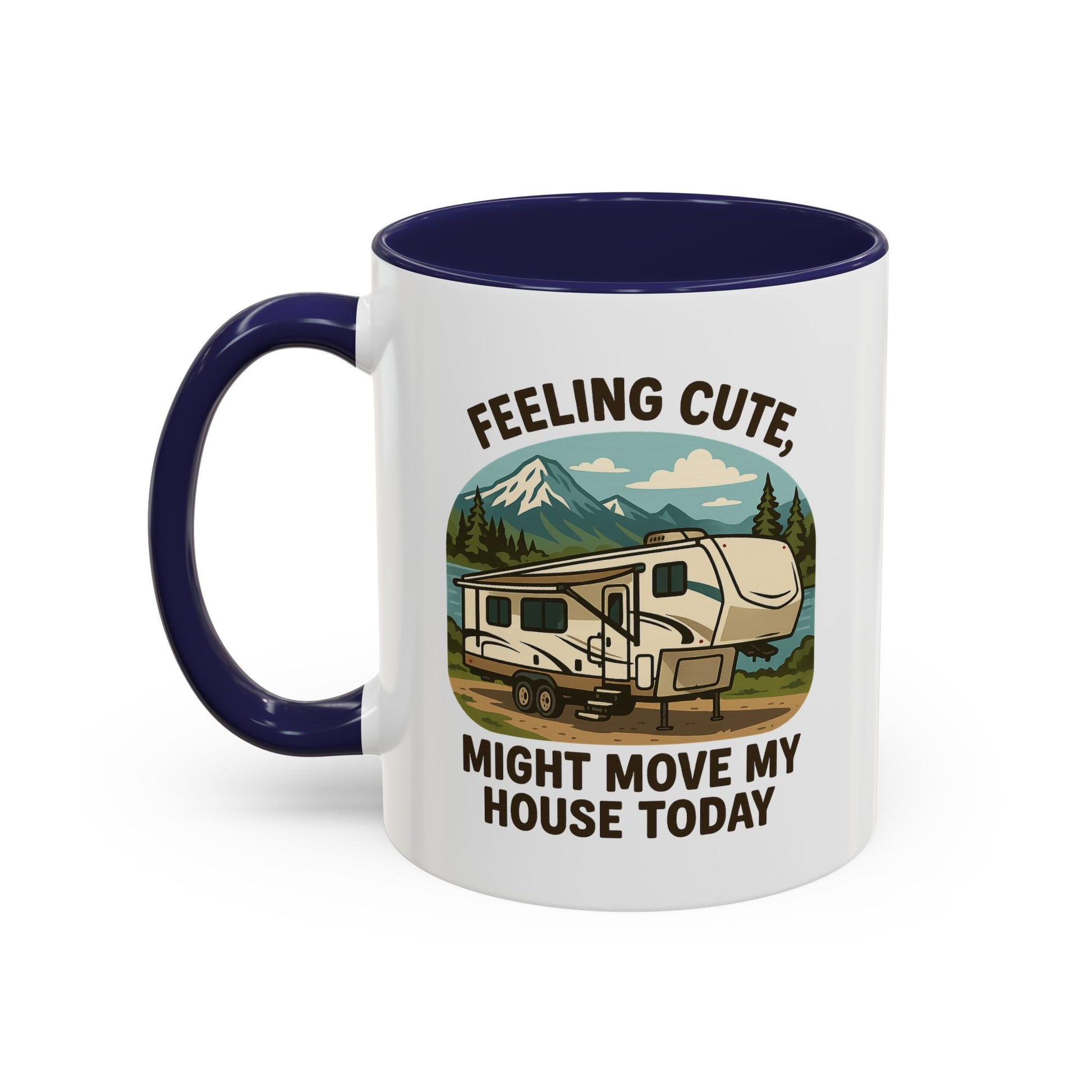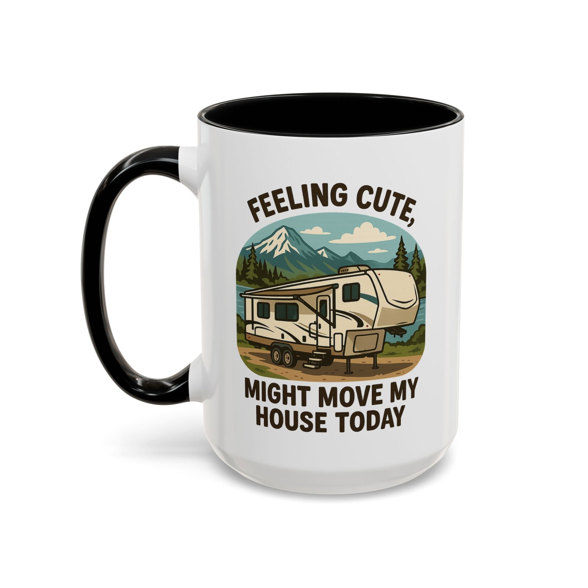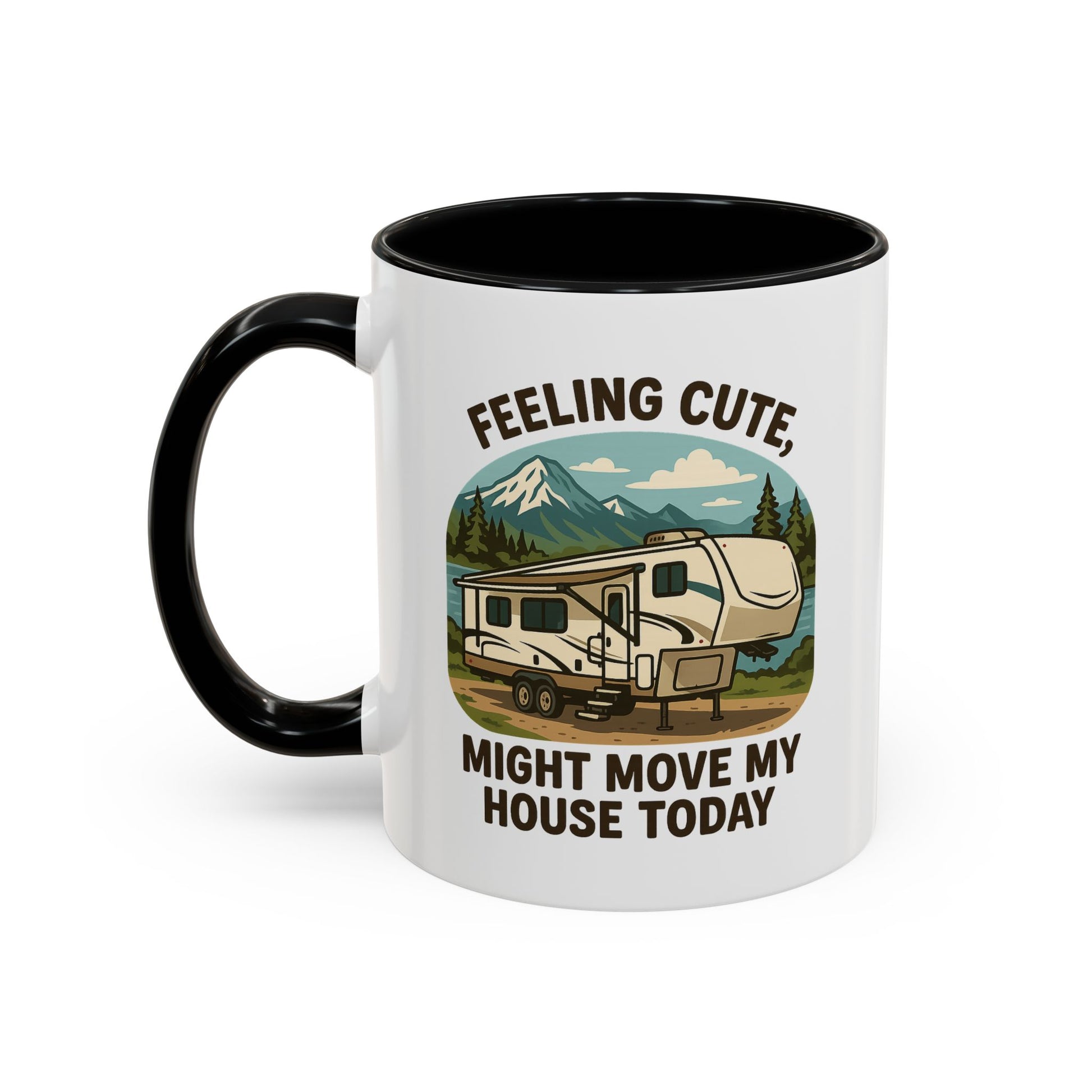 Featuring a beautiful fifth wheel nestled against a mountain backdrop with the delightfully spontaneous declaration "Feeling Cute Might Move My House Today", this mug perfectly captures that uniquely RV moment when you realize you have the power to just... leave. Today. Right now. Because you can.
