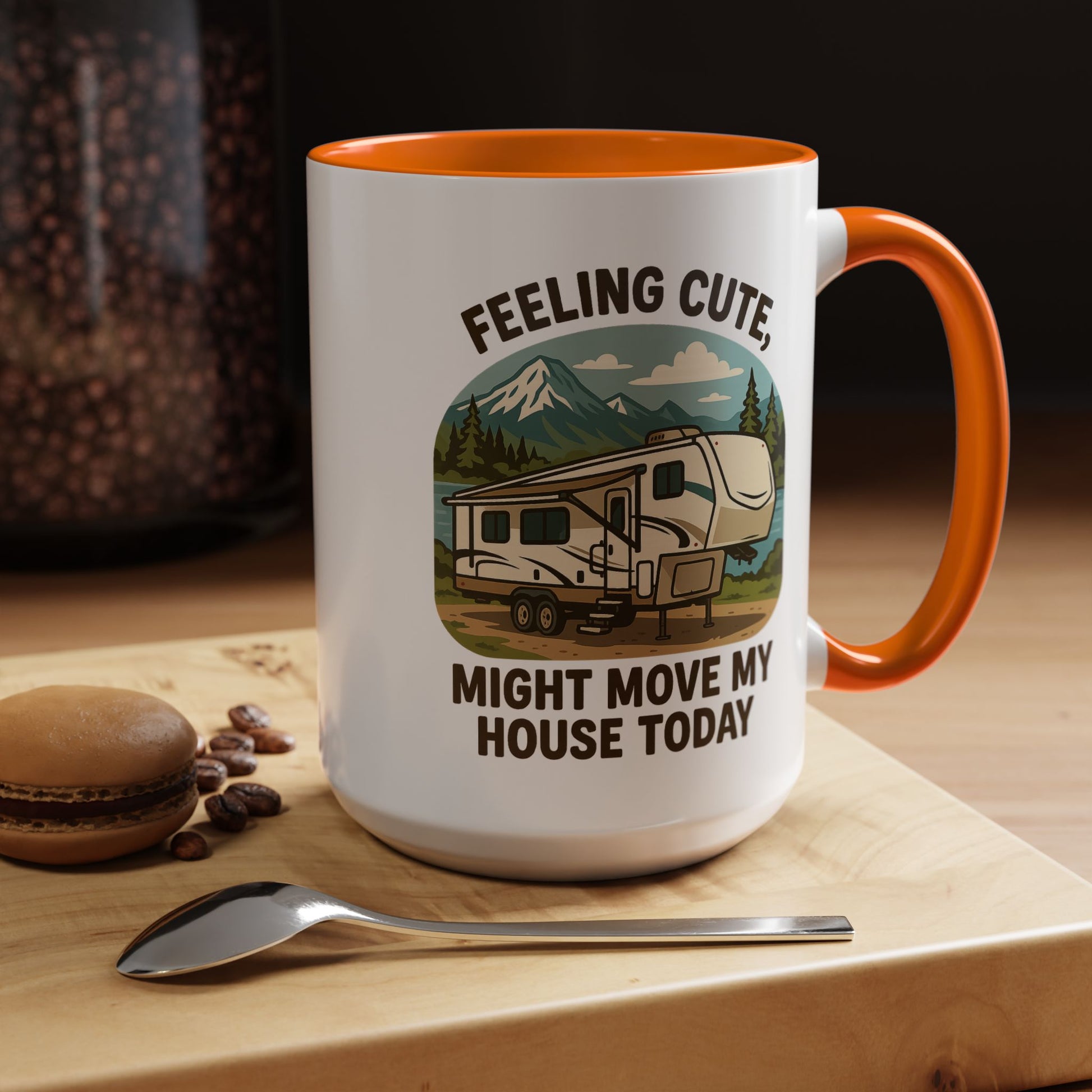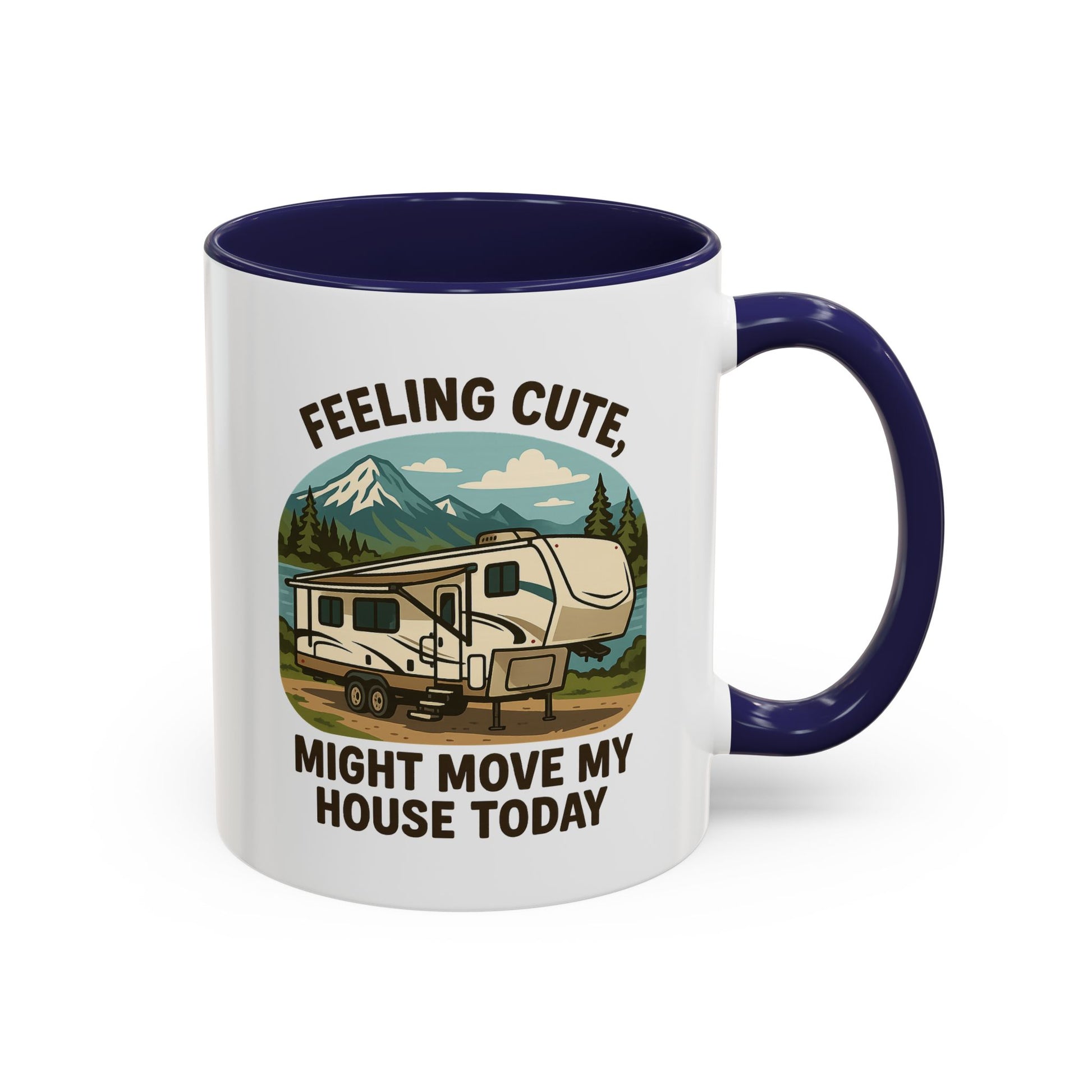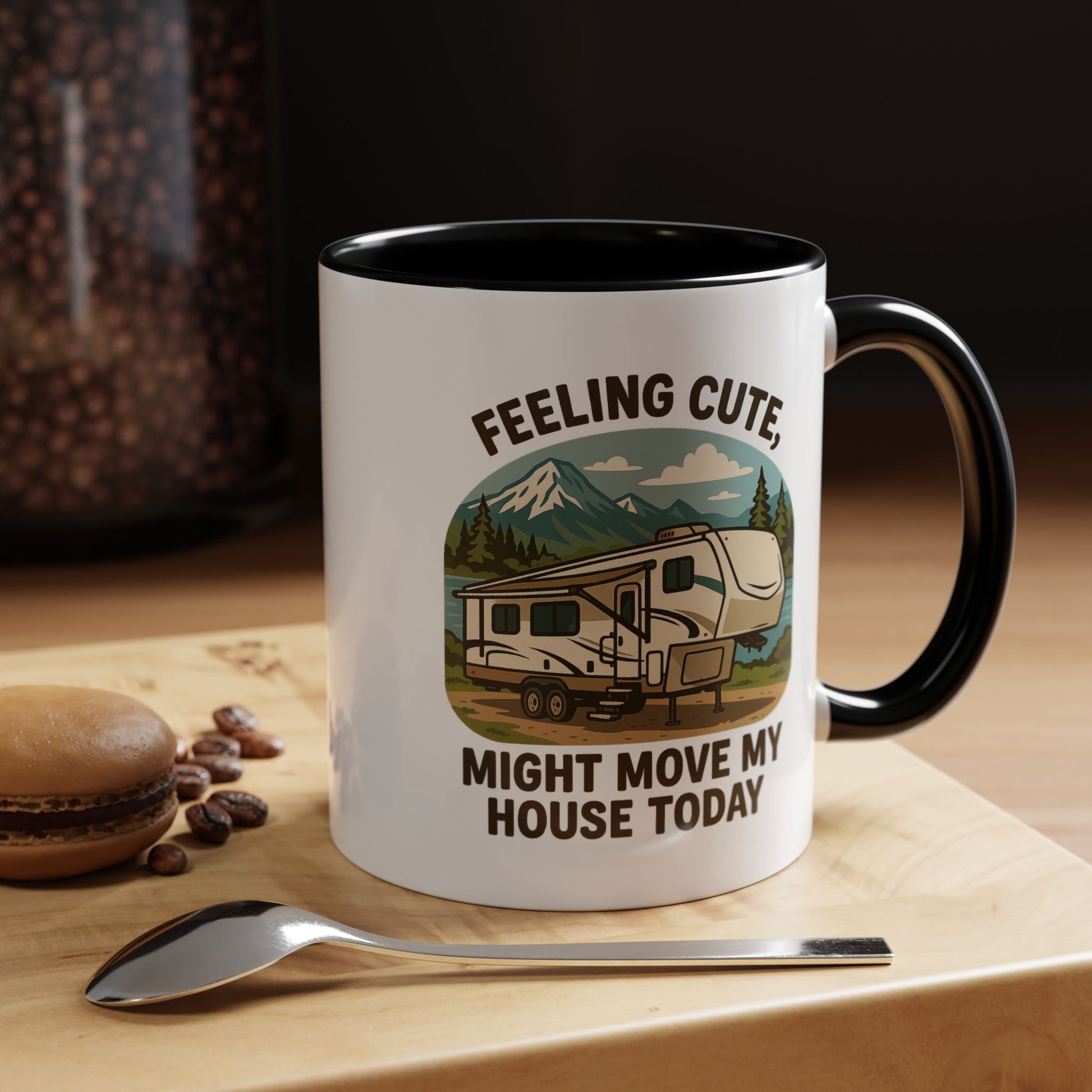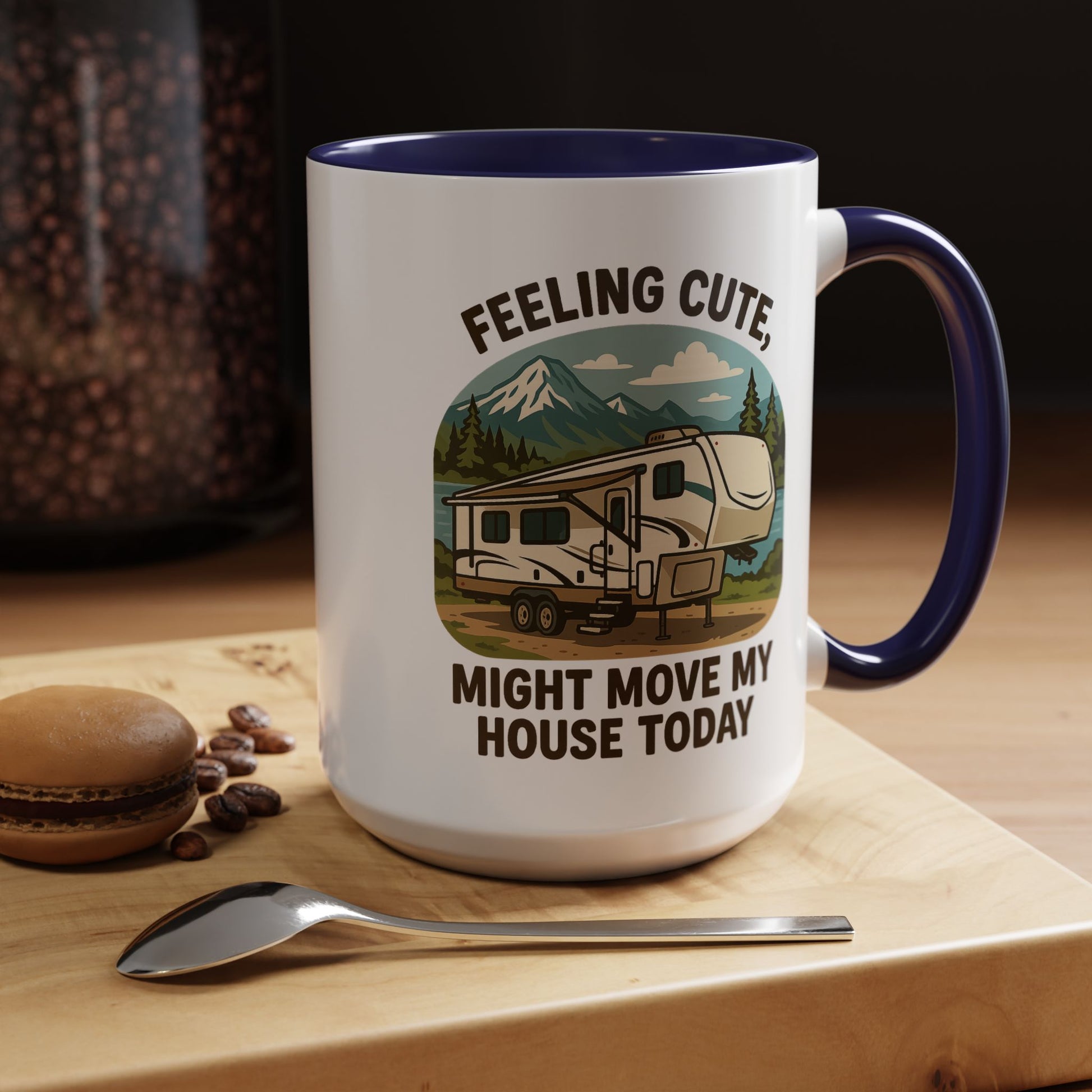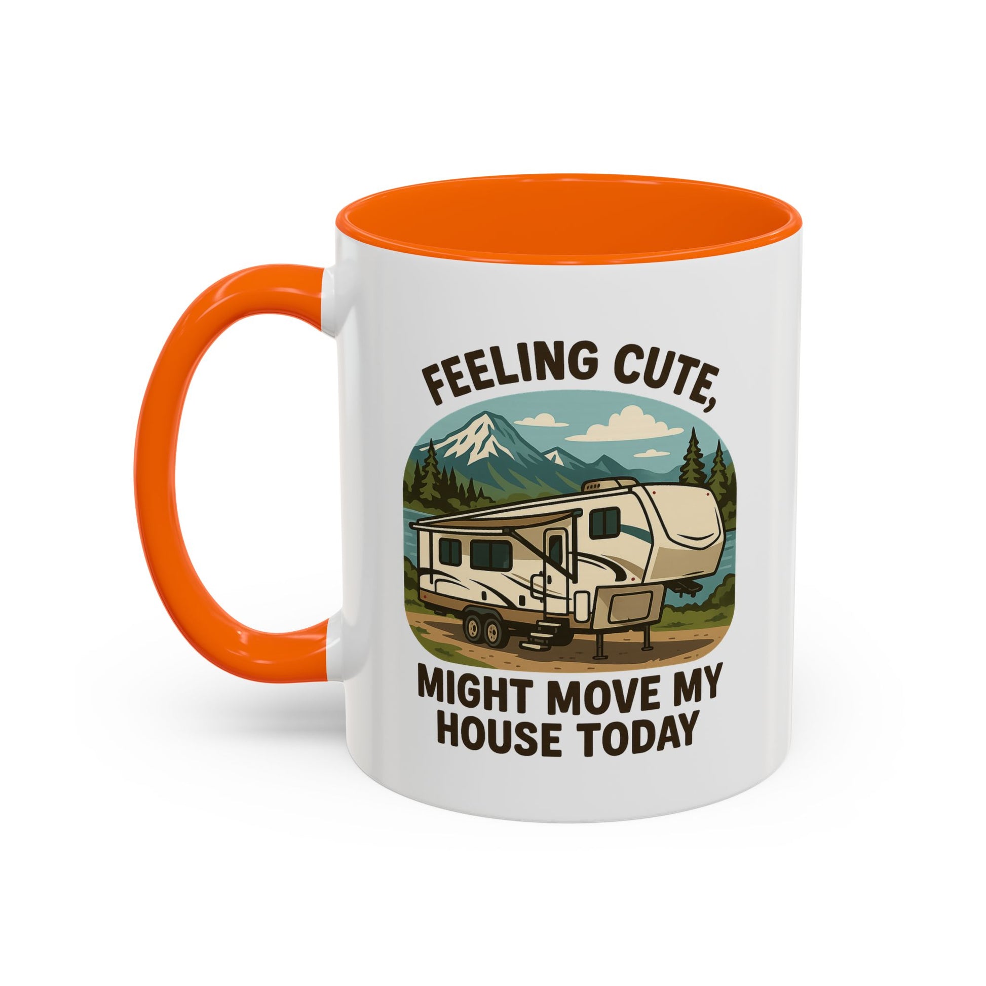 Featuring a beautiful fifth wheel nestled against a mountain backdrop with the delightfully spontaneous declaration "Feeling Cute Might Move My House Today", this mug perfectly captures that uniquely RV moment when you realize you have the power to just... leave. Today. Right now. Because you can.