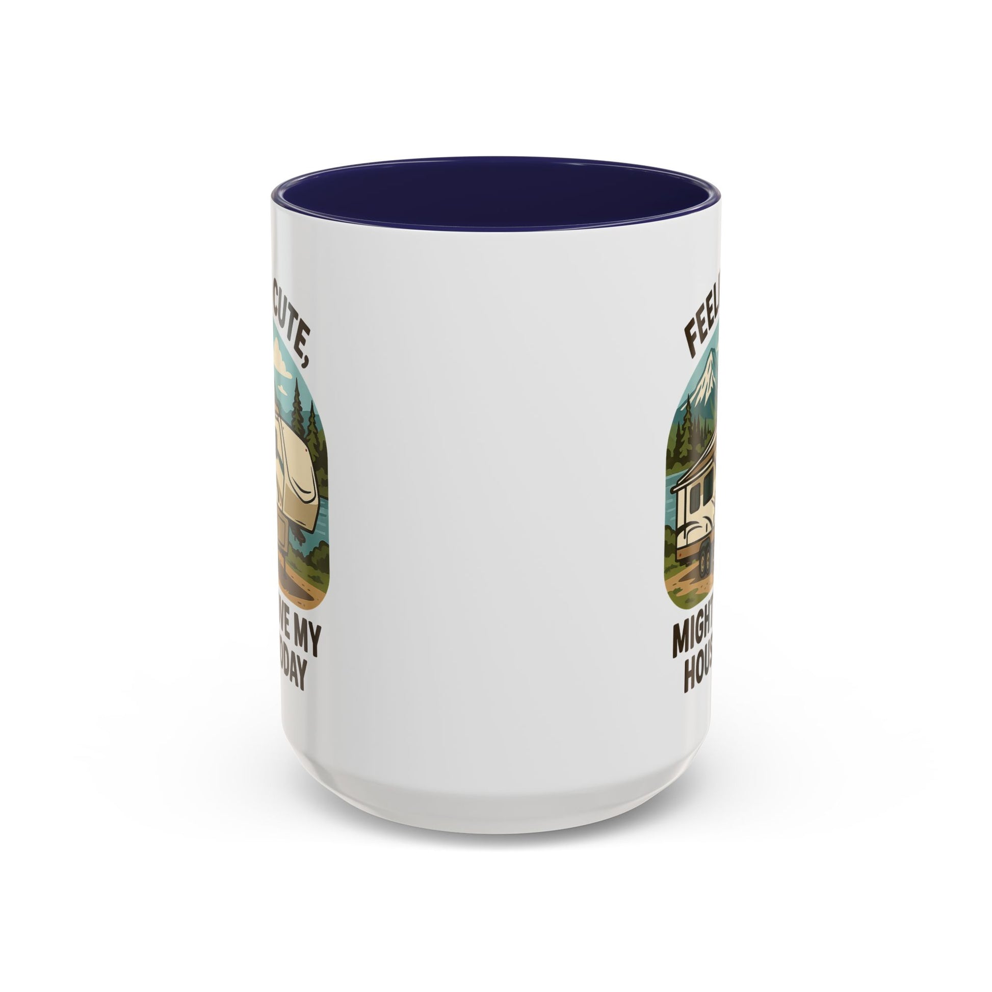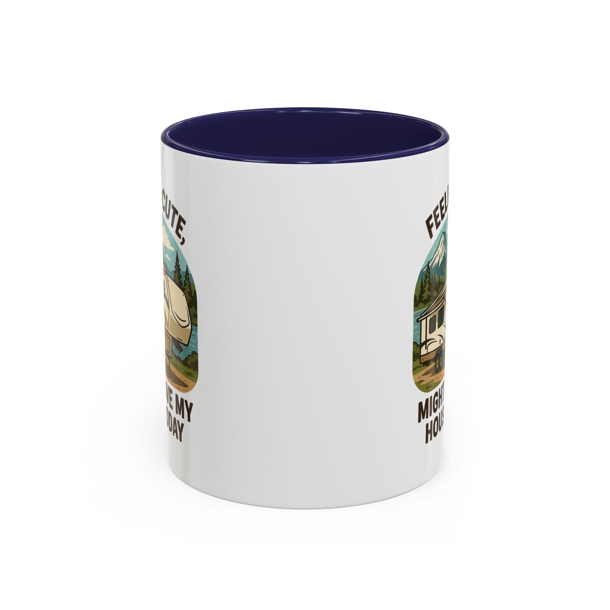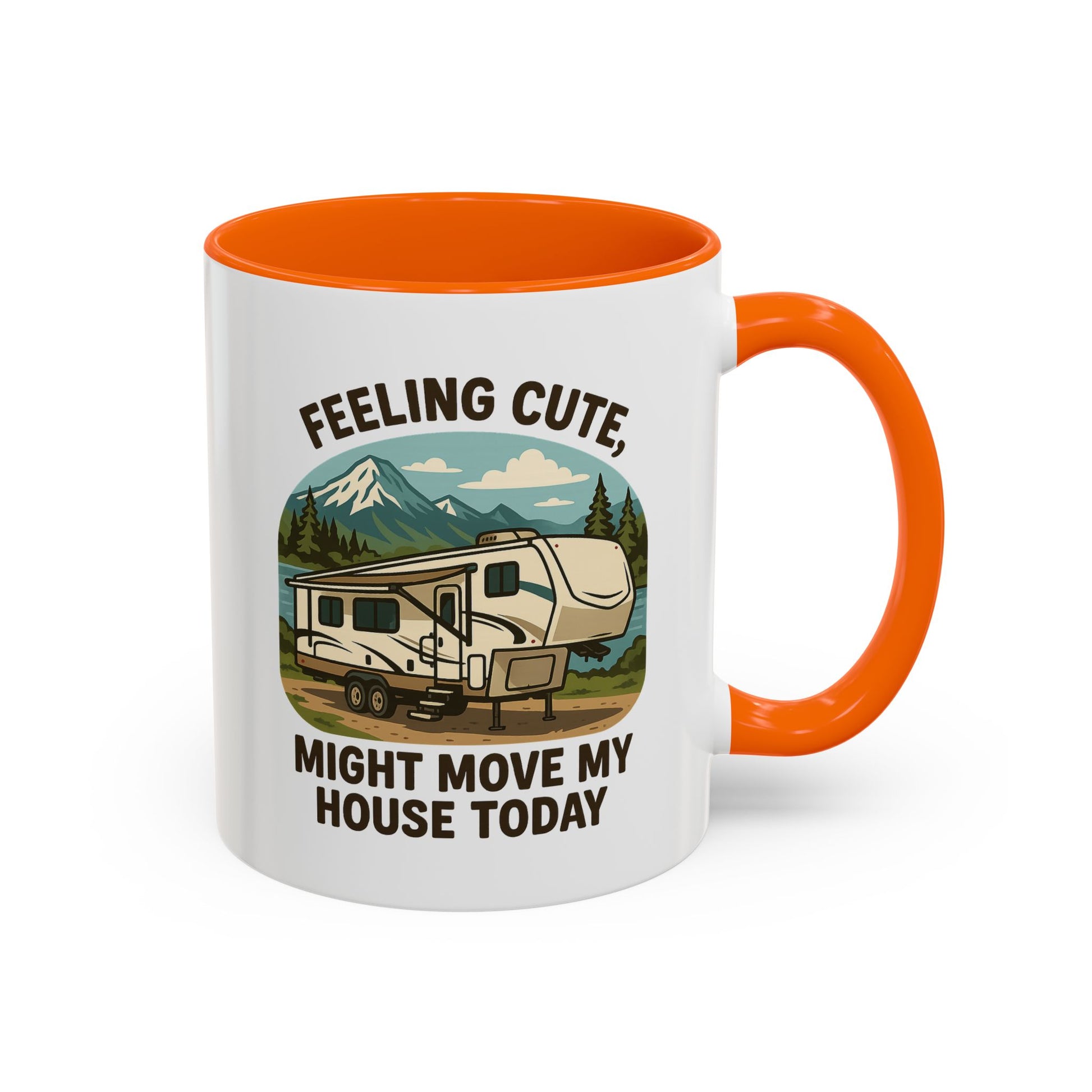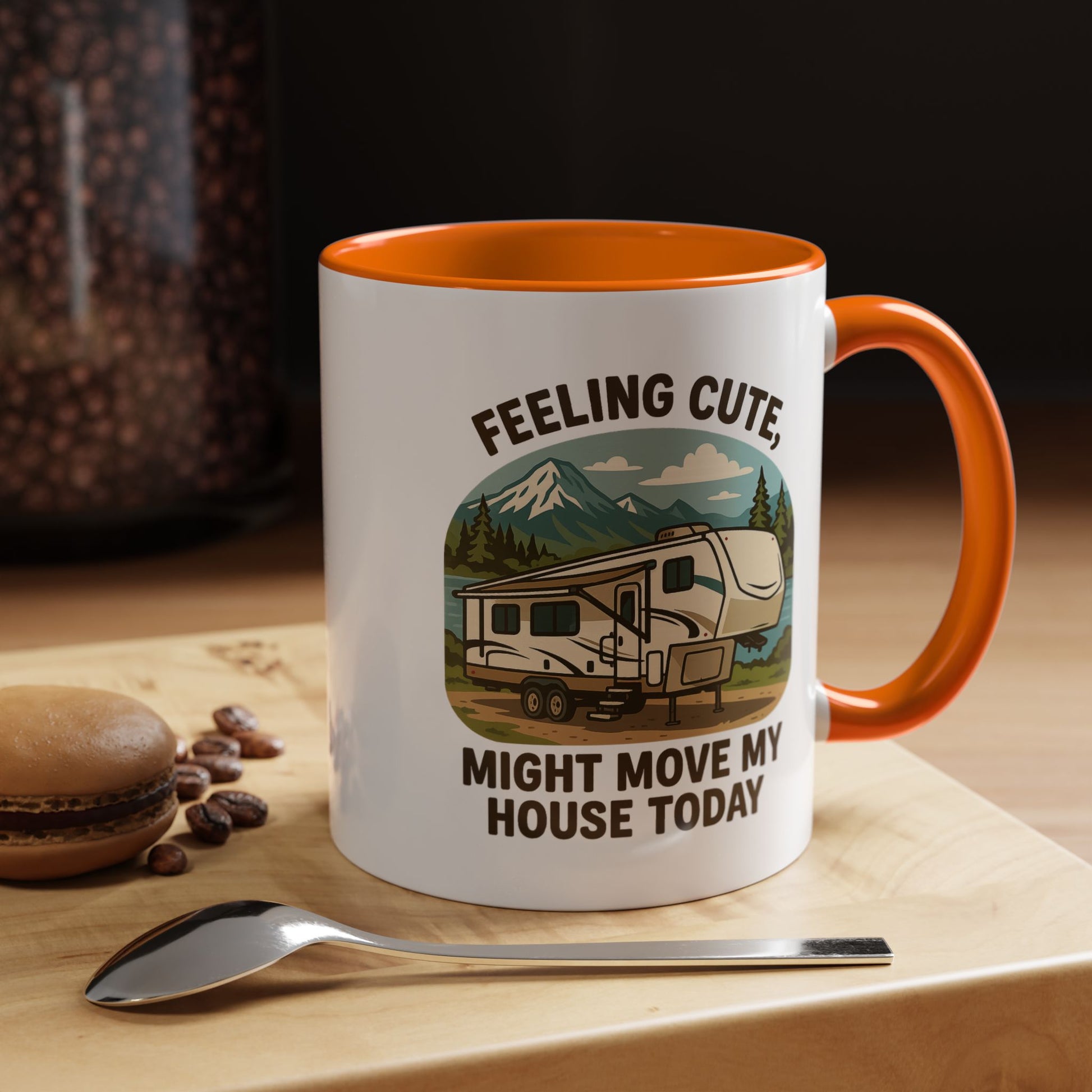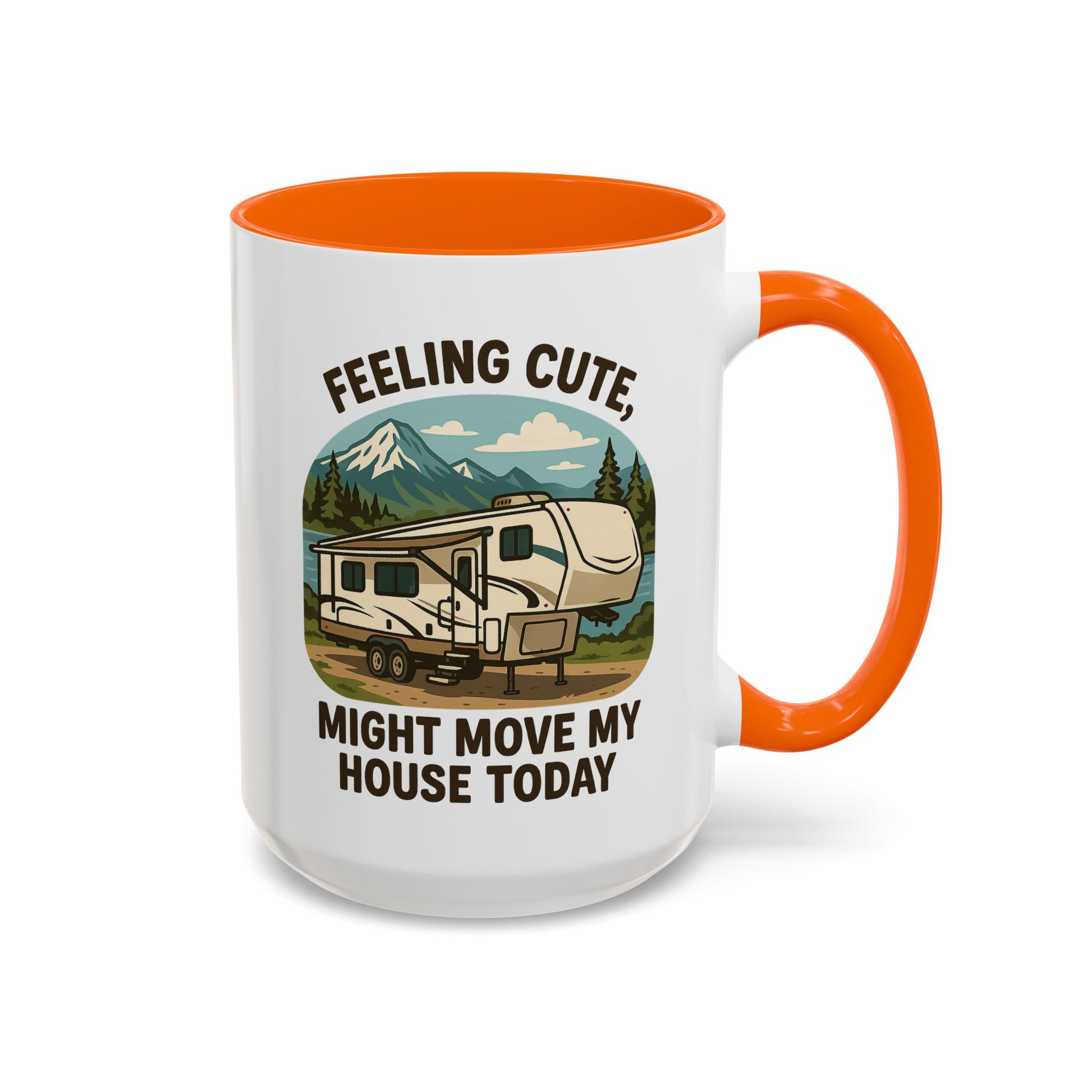 Featuring a beautiful fifth wheel nestled against a mountain backdrop with the delightfully spontaneous declaration "Feeling Cute Might Move My House Today", this mug perfectly captures that uniquely RV moment when you realize you have the power to just... leave. Today. Right now. Because you can.
