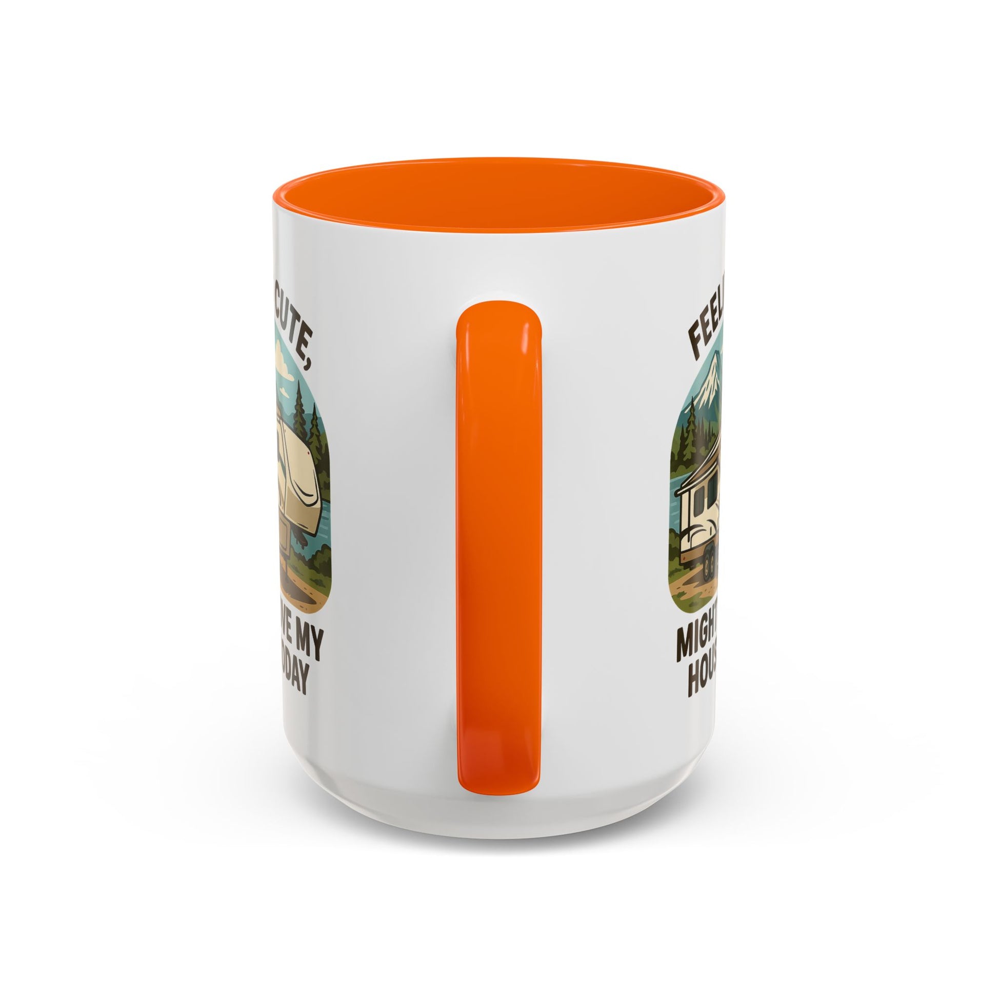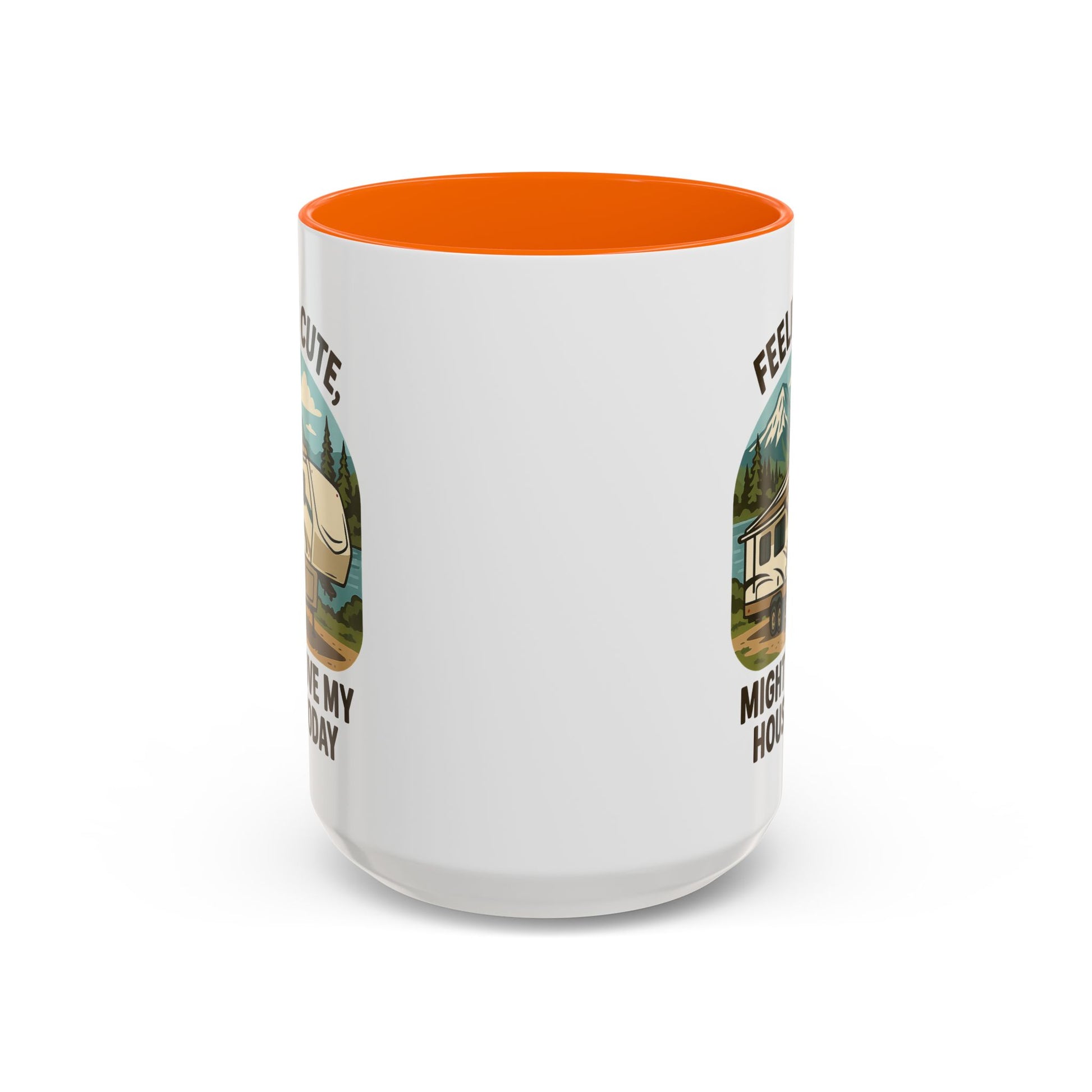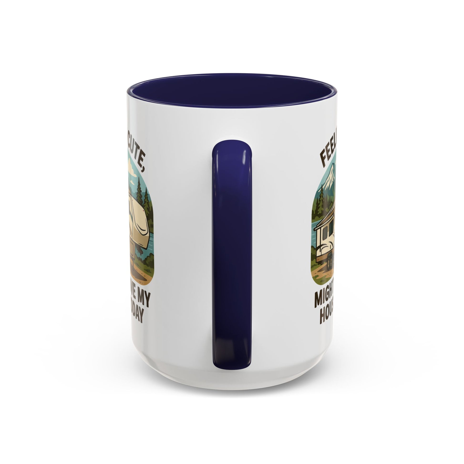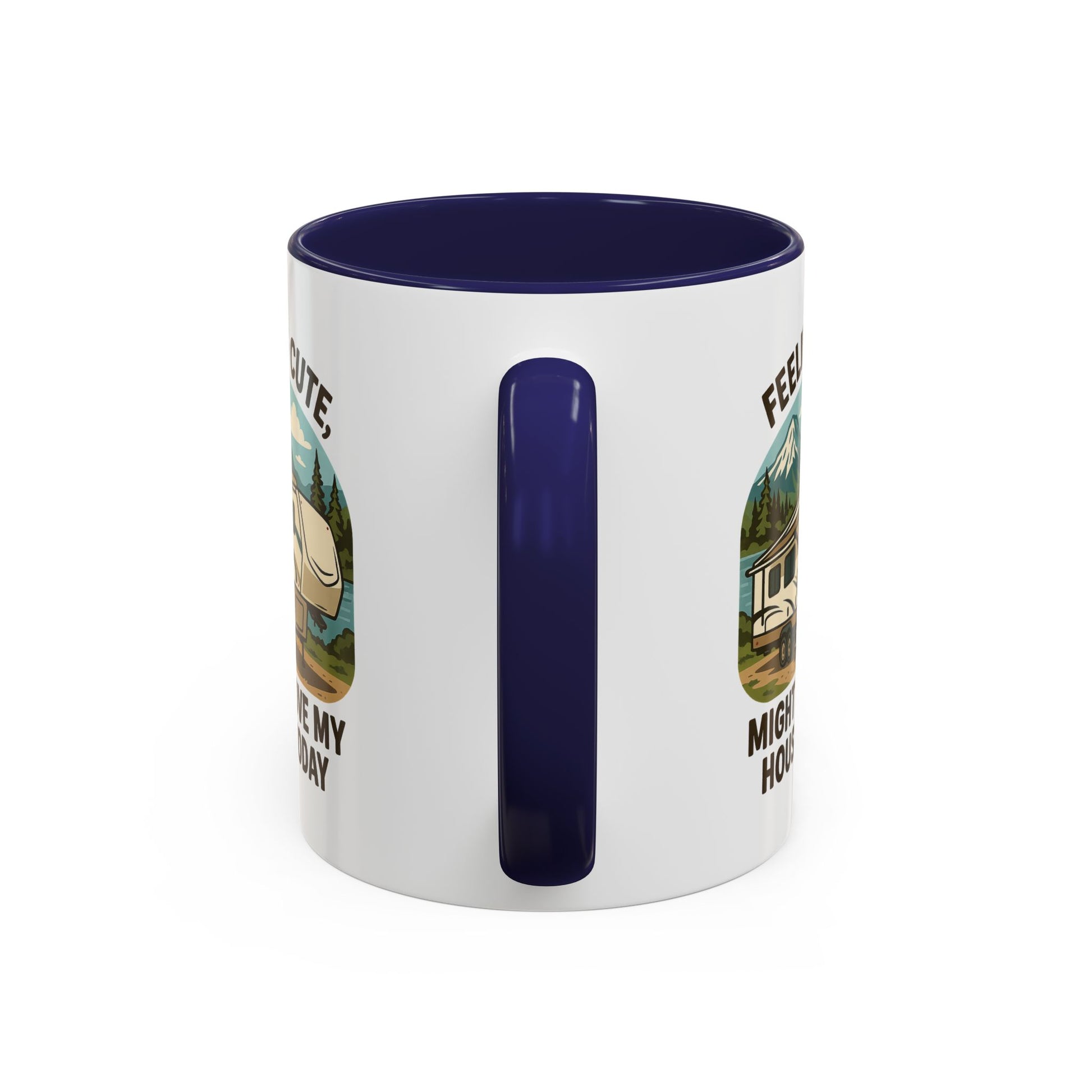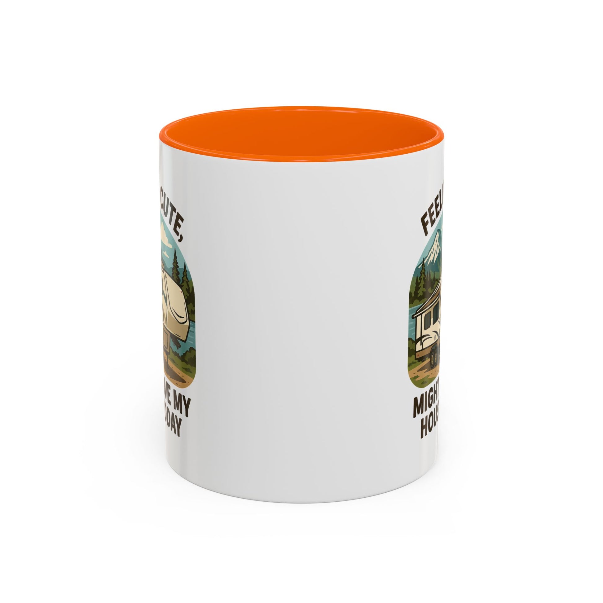 Featuring a beautiful fifth wheel nestled against a mountain backdrop with the delightfully spontaneous declaration "Feeling Cute Might Move My House Today", this mug perfectly captures that uniquely RV moment when you realize you have the power to just... leave. Today. Right now. Because you can.