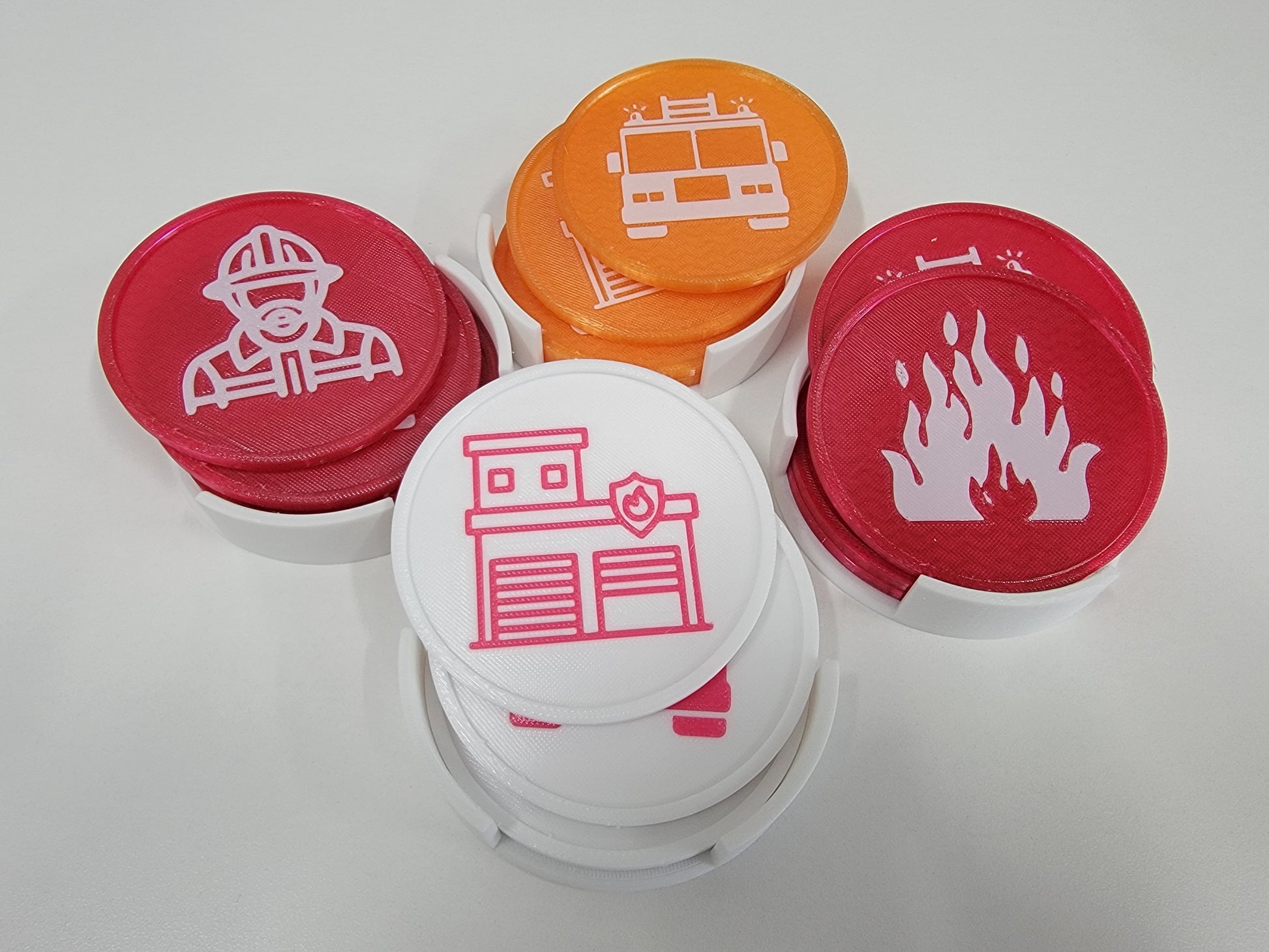 This custom 4-pack features boldly designed firefighter-themed coasters showcasing fire trucks, brave firefighters, fire stations, and dramatic flame designs, all nestled in a matching holder that keeps your gear as organized as your station house. Each coaster is designed and printed in-house with the same attention to detail you'd expect from people who literally save lives for a living.