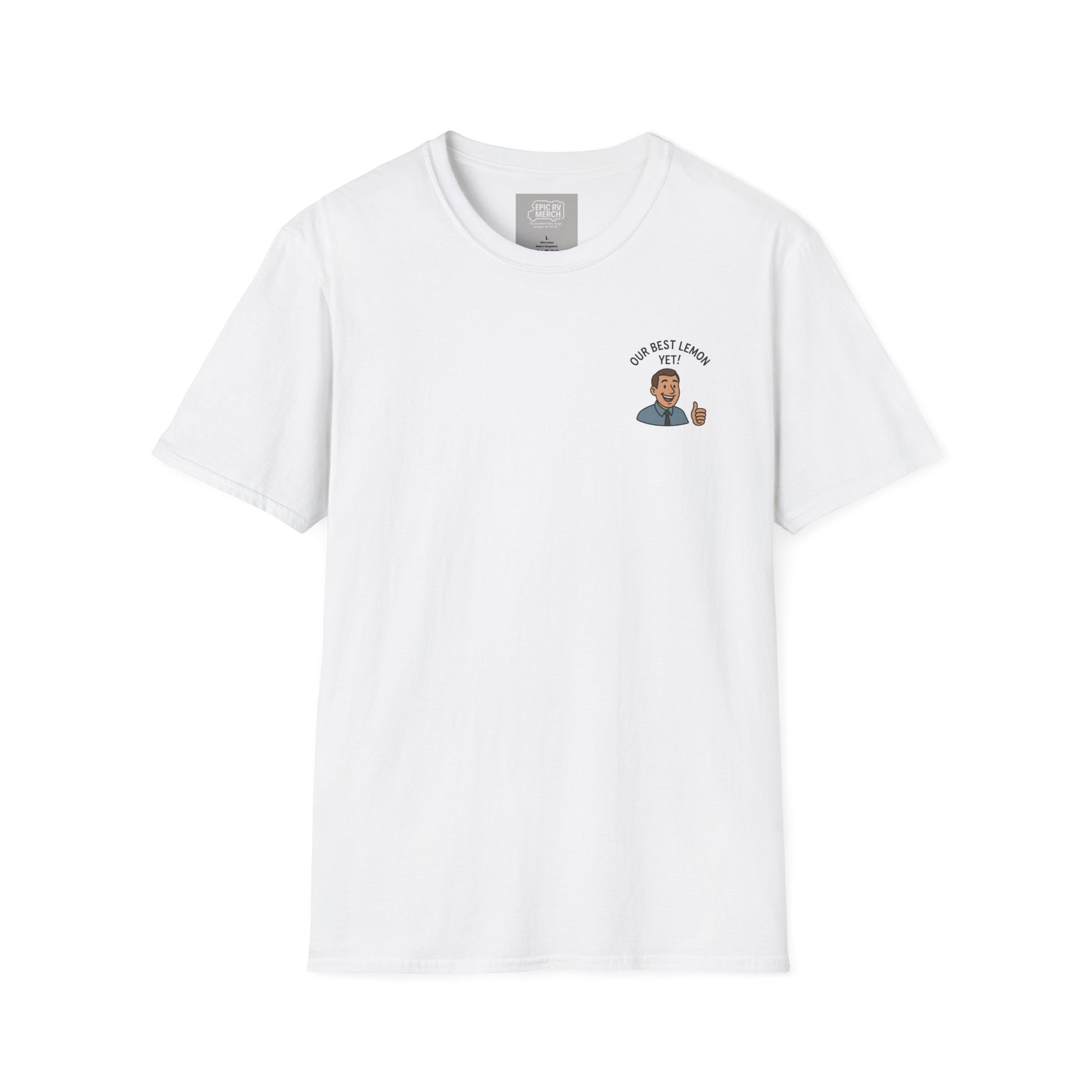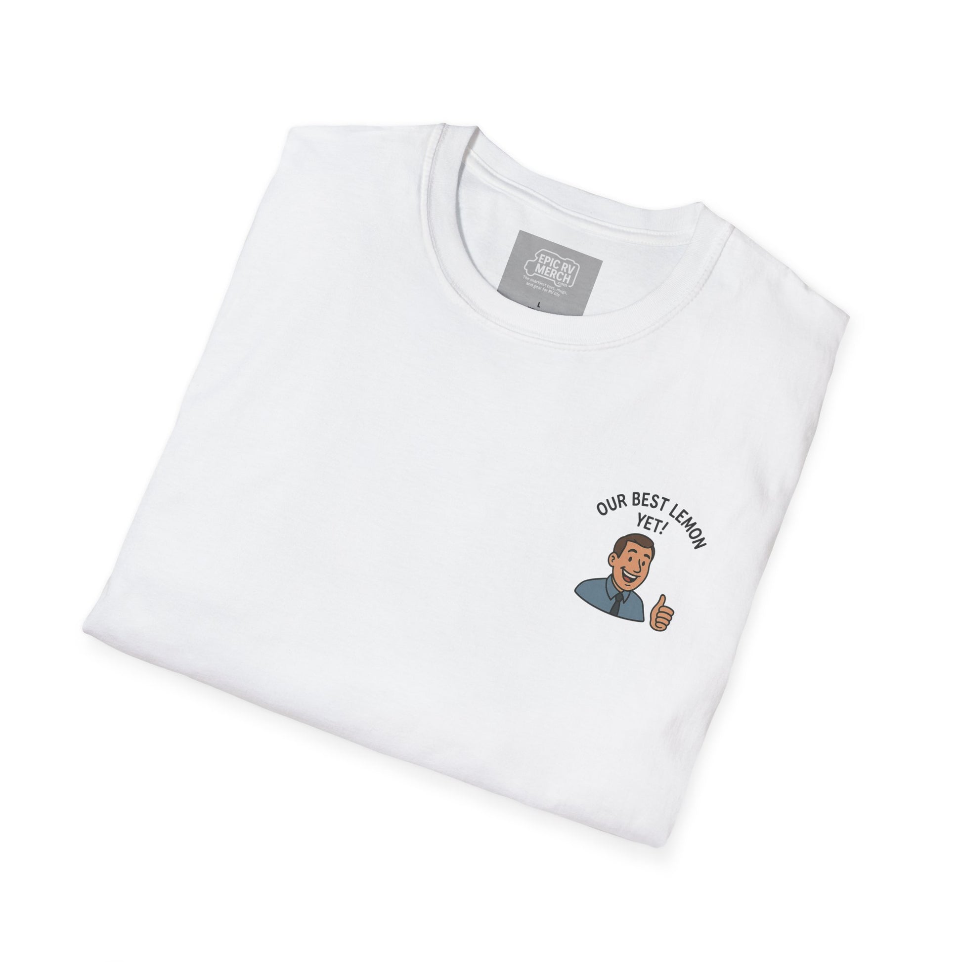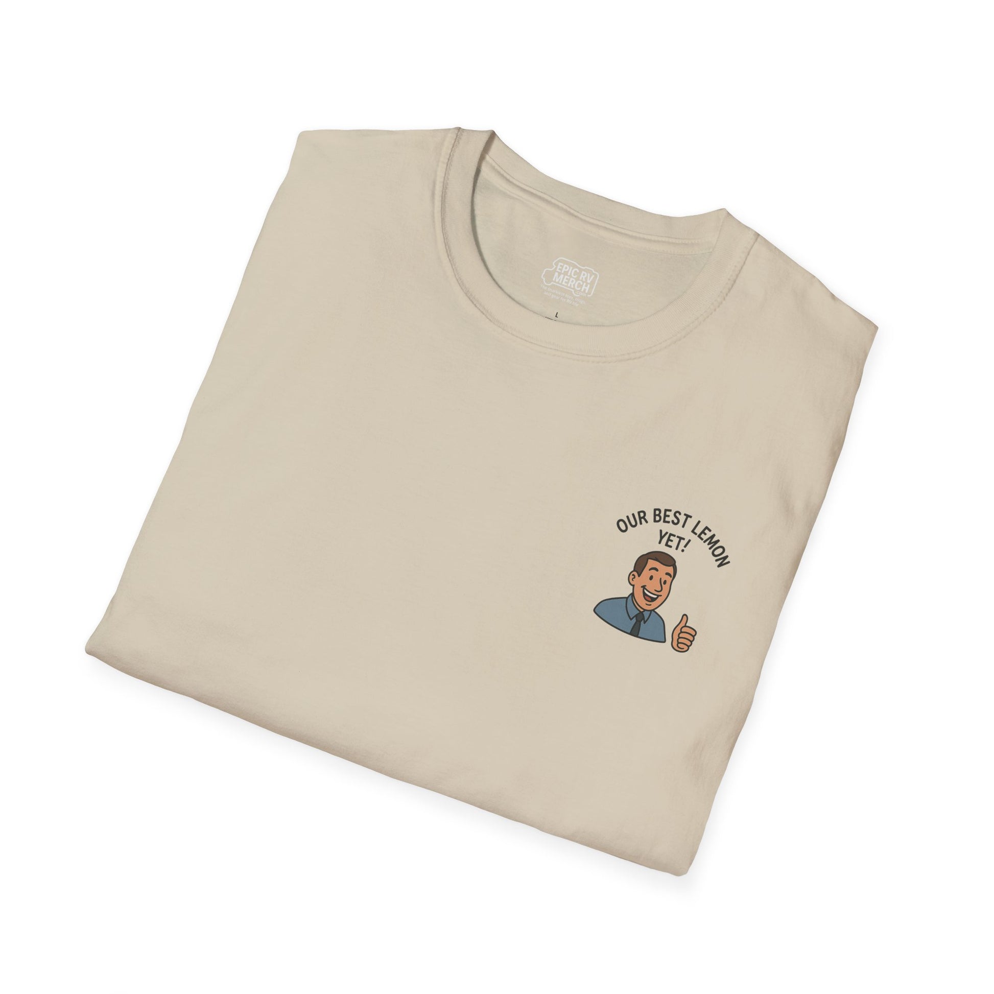 Featuring a grinning salesman cheerfully explaining that your new RV will be held hostage for the duration of the summer, this design is the perfect uniform for anyone who's ever asked, “Is it supposed to leak this much?” The back design says it all. The front? A tiny, grinning stamp of approval from the same overly optimistic salesman—proudly declaring “Our Best Lemon Yet!”
