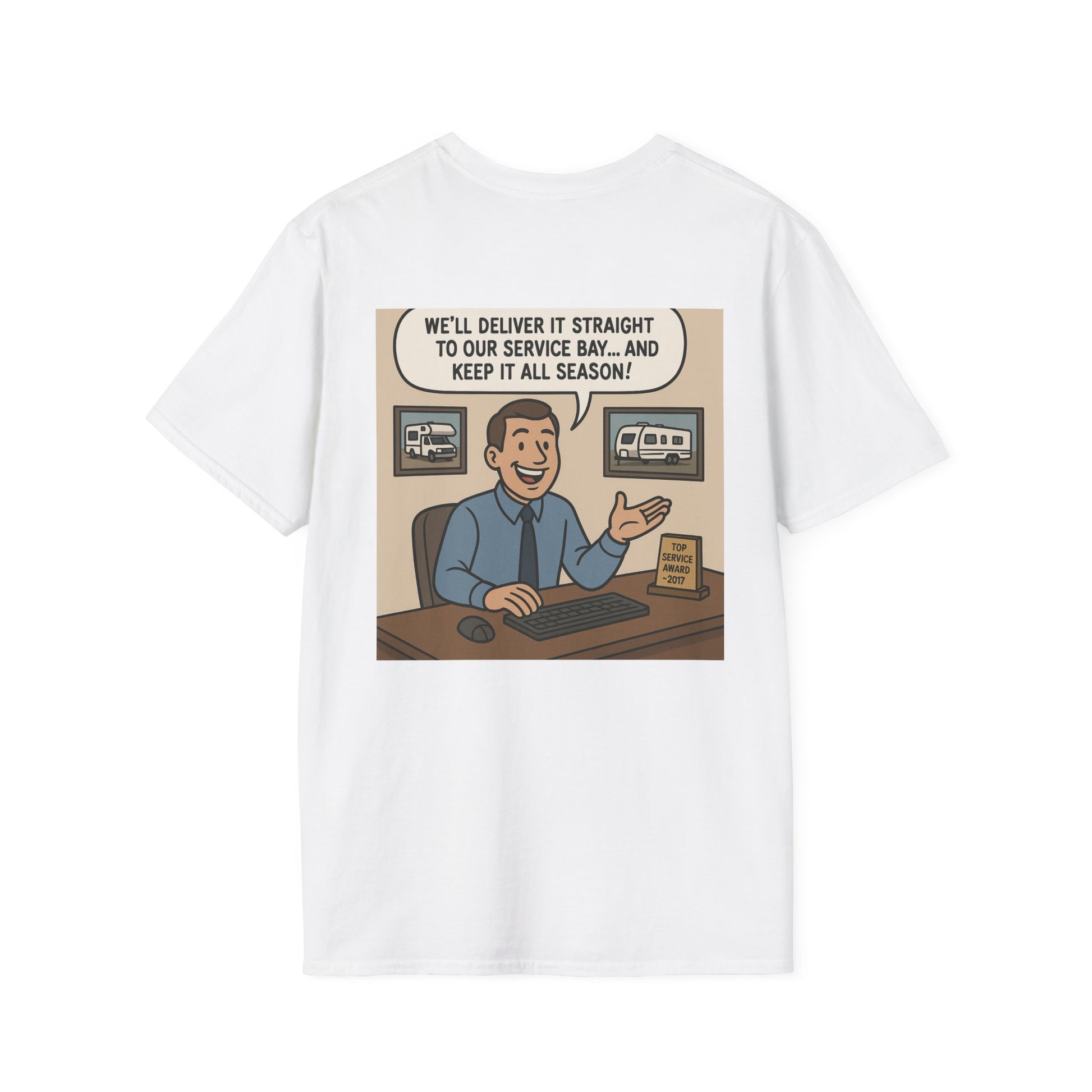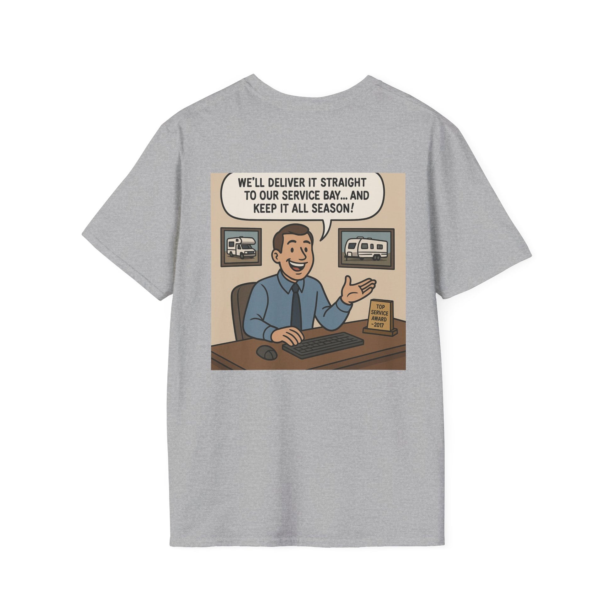 If you’ve ever had your camping season canceled by a service appointment backlog, this shirt’s for you. It captures the full RV buying experience: bright-eyed promises, a desk job smile, and an express lane to the service bay.