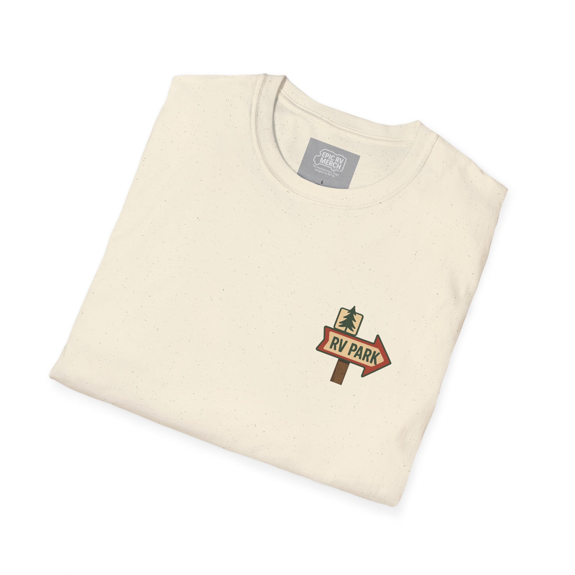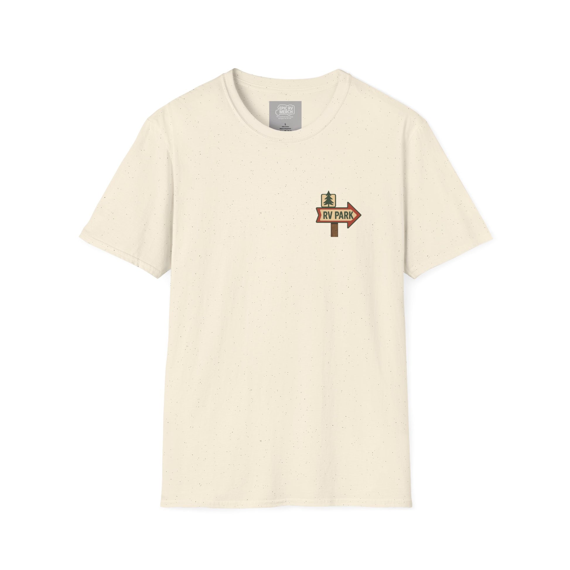 The back graphic features a retro RV screeching to a heroic stop, sewer hose coiled like a trophy, and even a squirrel bearing witness to the glory. On the front, a simple vintage RV Park sign sits quietly on the pocket area—perfectly subtle, until you turn around and announce your priorities.