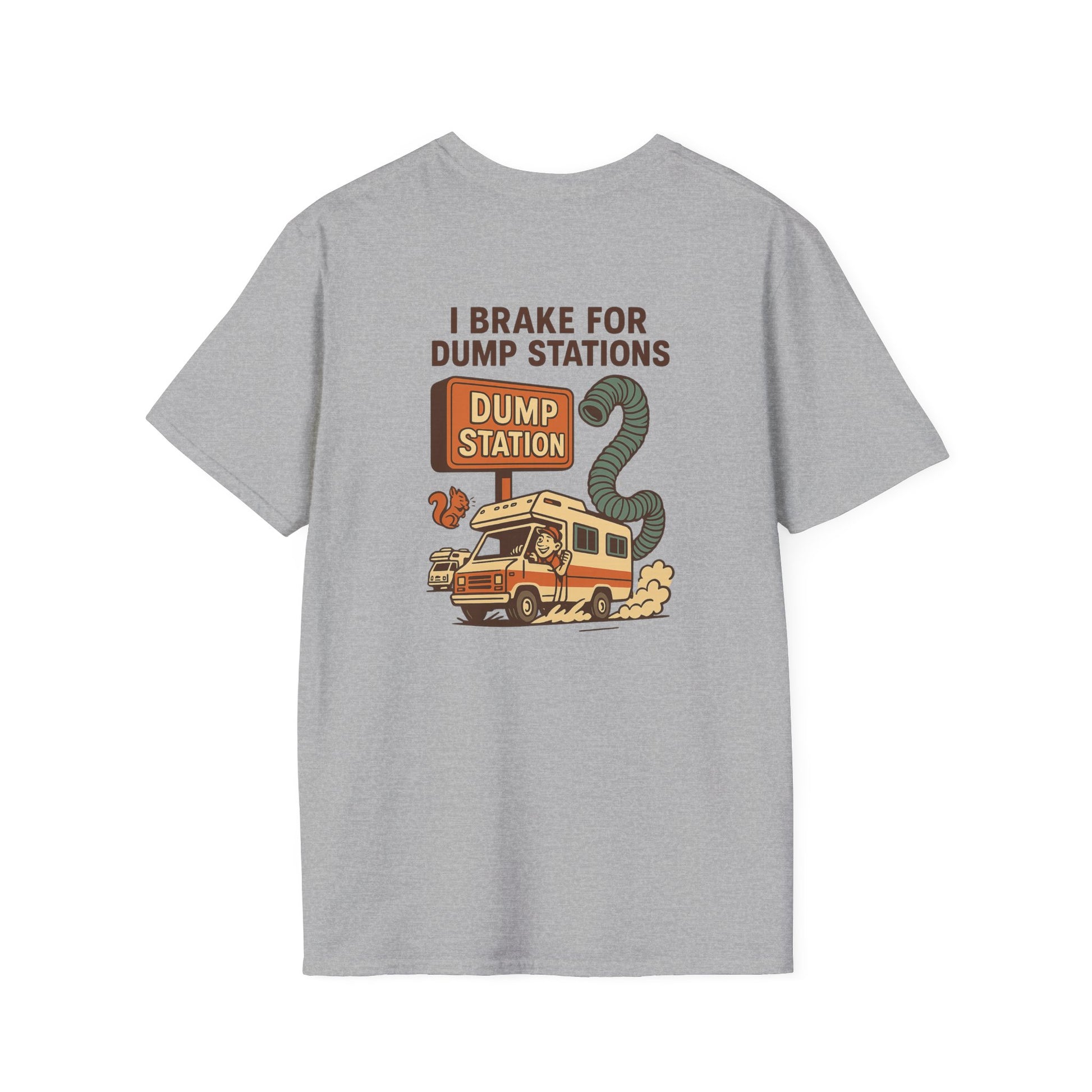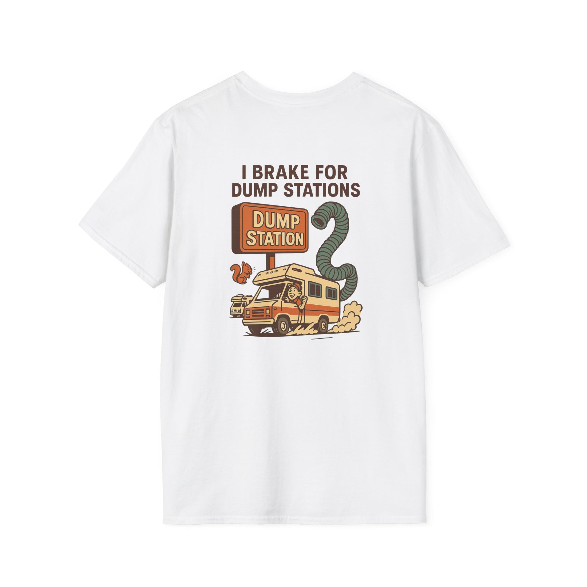 I Brake for Dump Stations – Funny Retro RV T-Shirt with Pocket Logo