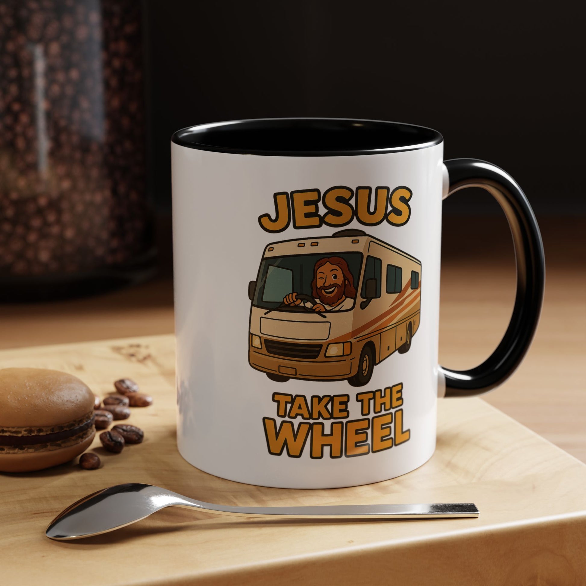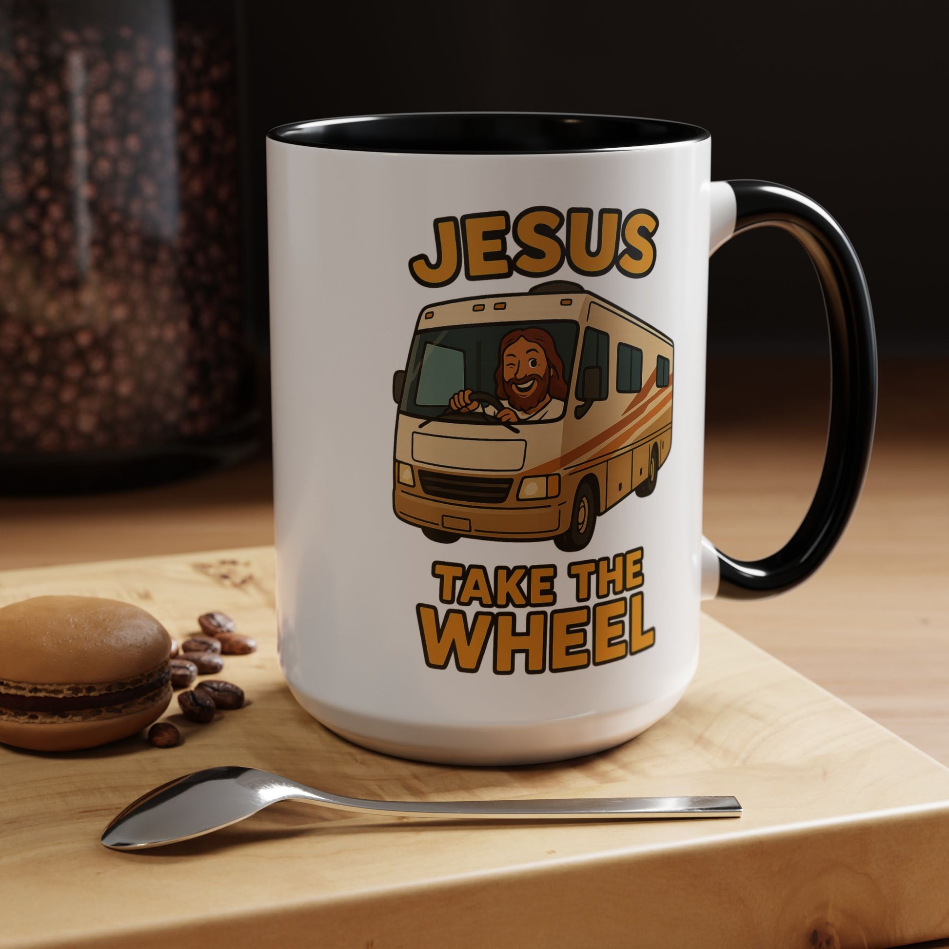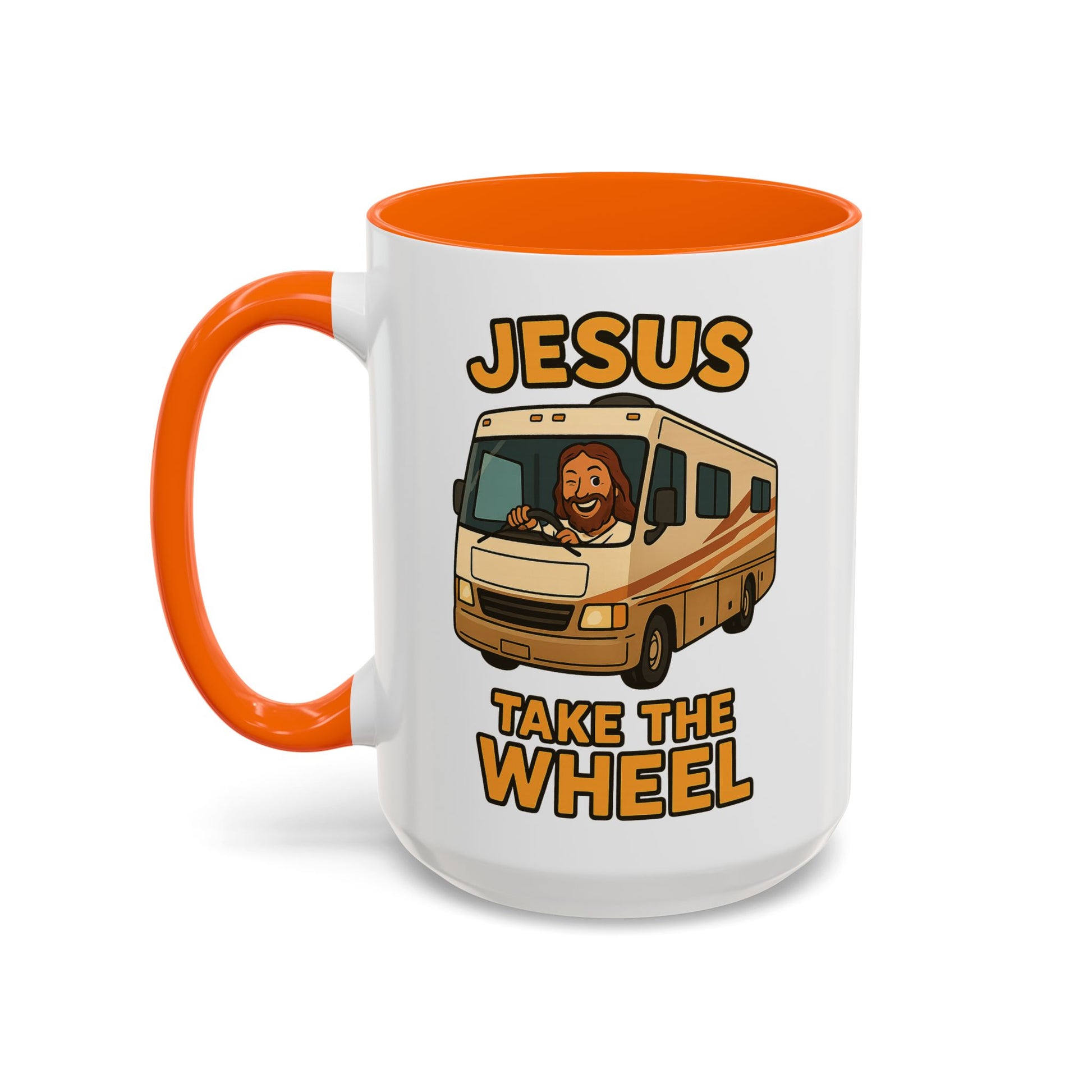 Featuring a cheerful Jesus confidently manning the helm of a classic motorhome with the desperate plea "Jesus Take The Wheel" boldly displayed, this mug captures that universal RV moment when you realize you're basically driving a small apartment building and maybe, just maybe, you're in over your head.