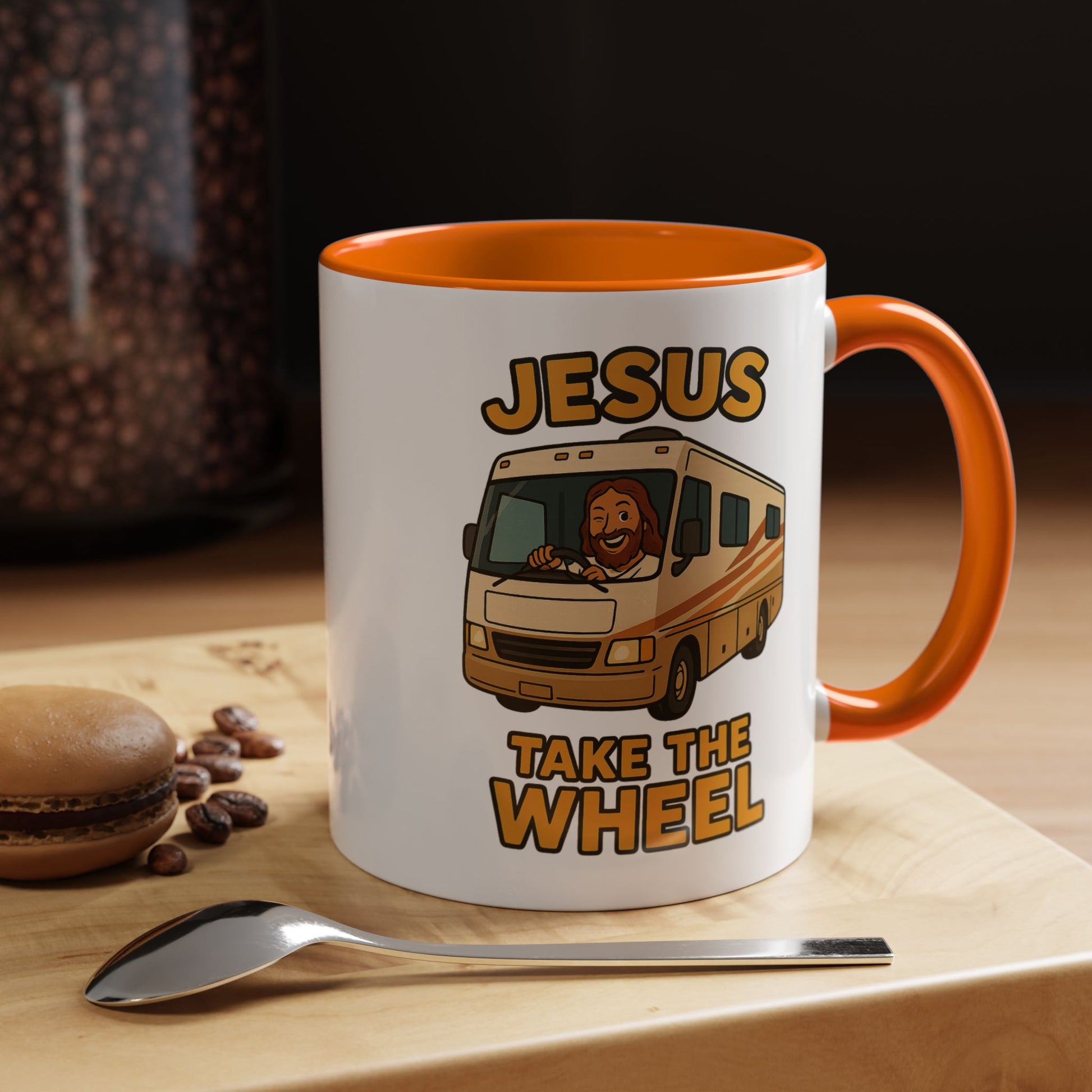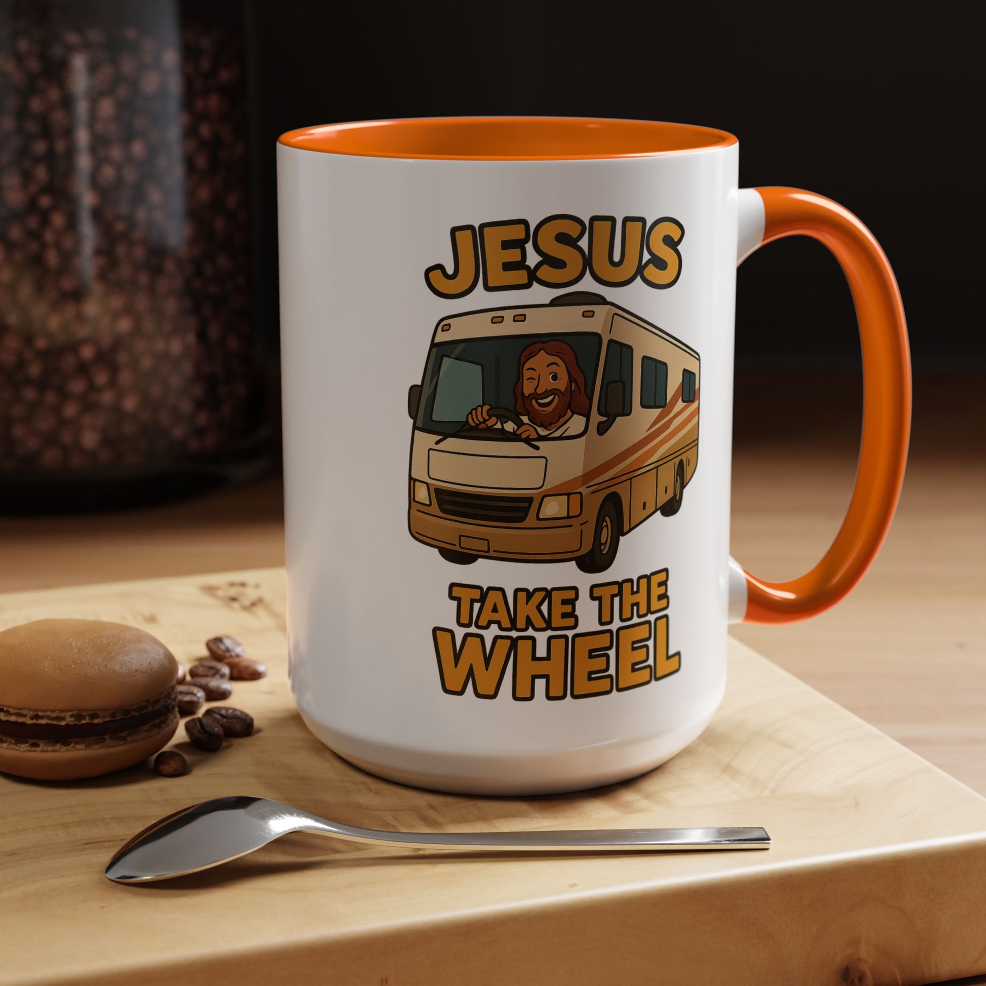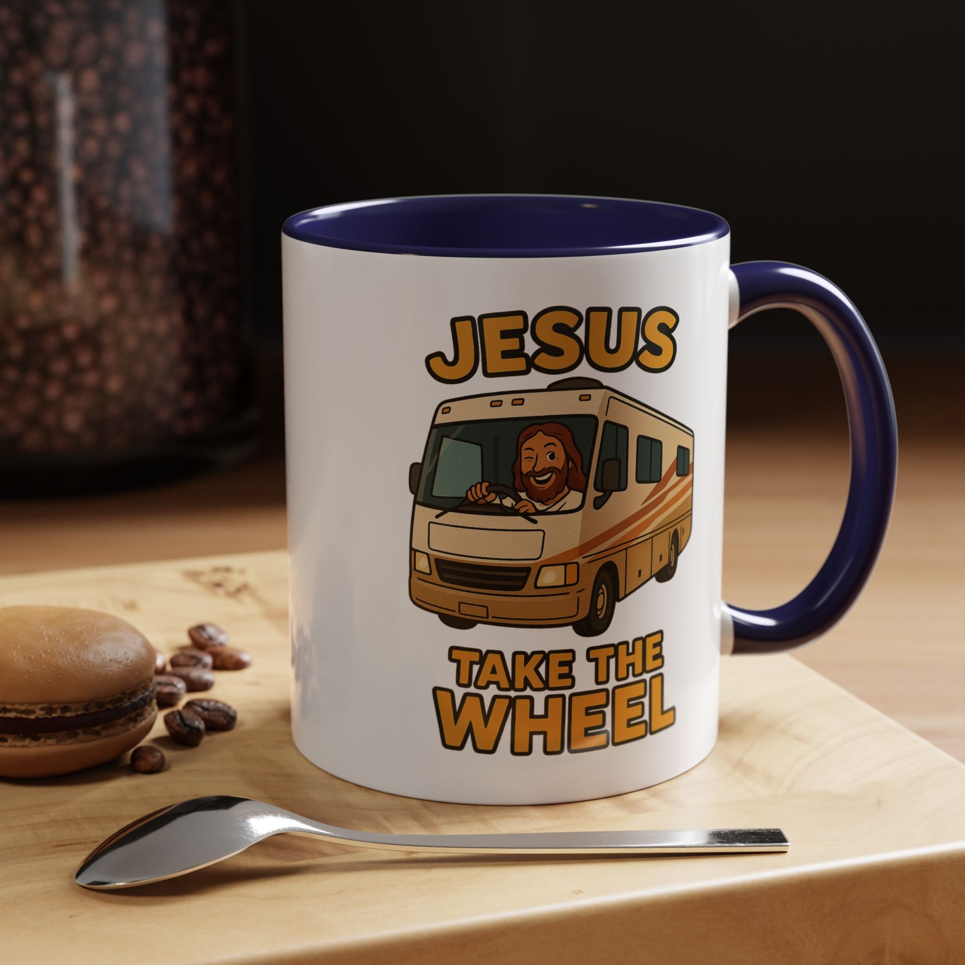 Featuring a cheerful Jesus confidently manning the helm of a classic motorhome with the desperate plea "Jesus Take The Wheel" boldly displayed, this mug captures that universal RV moment when you realize you're basically driving a small apartment building and maybe, just maybe, you're in over your head.
