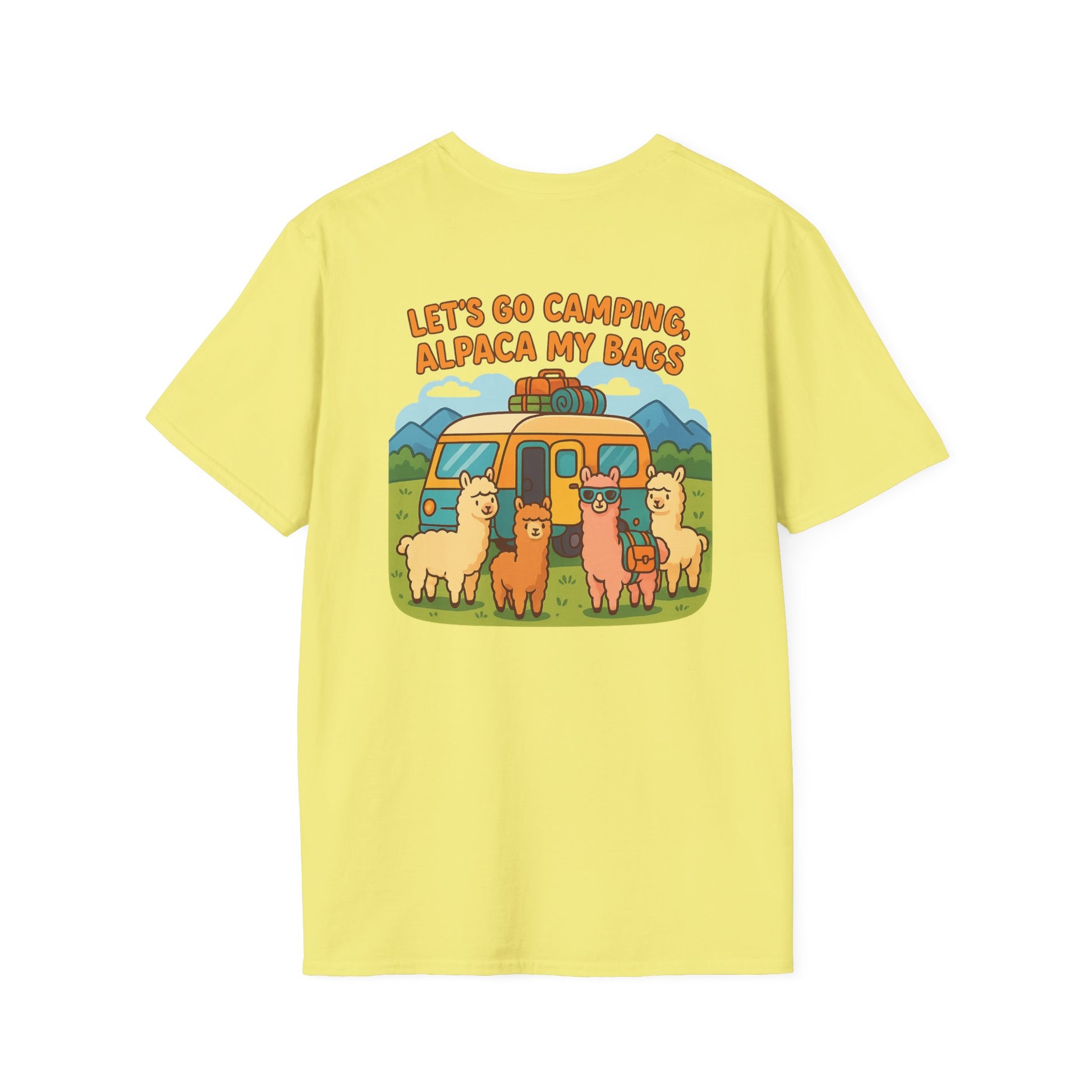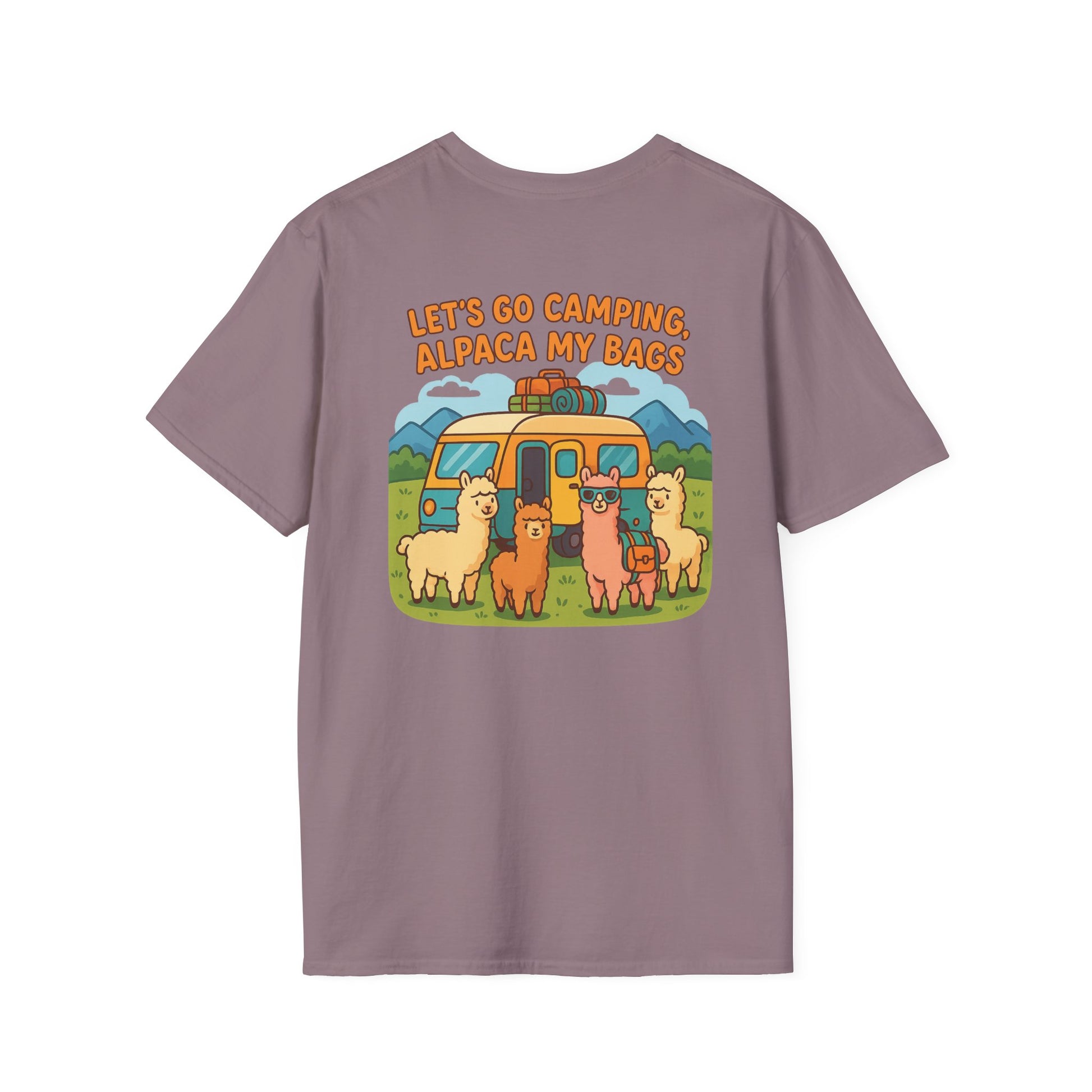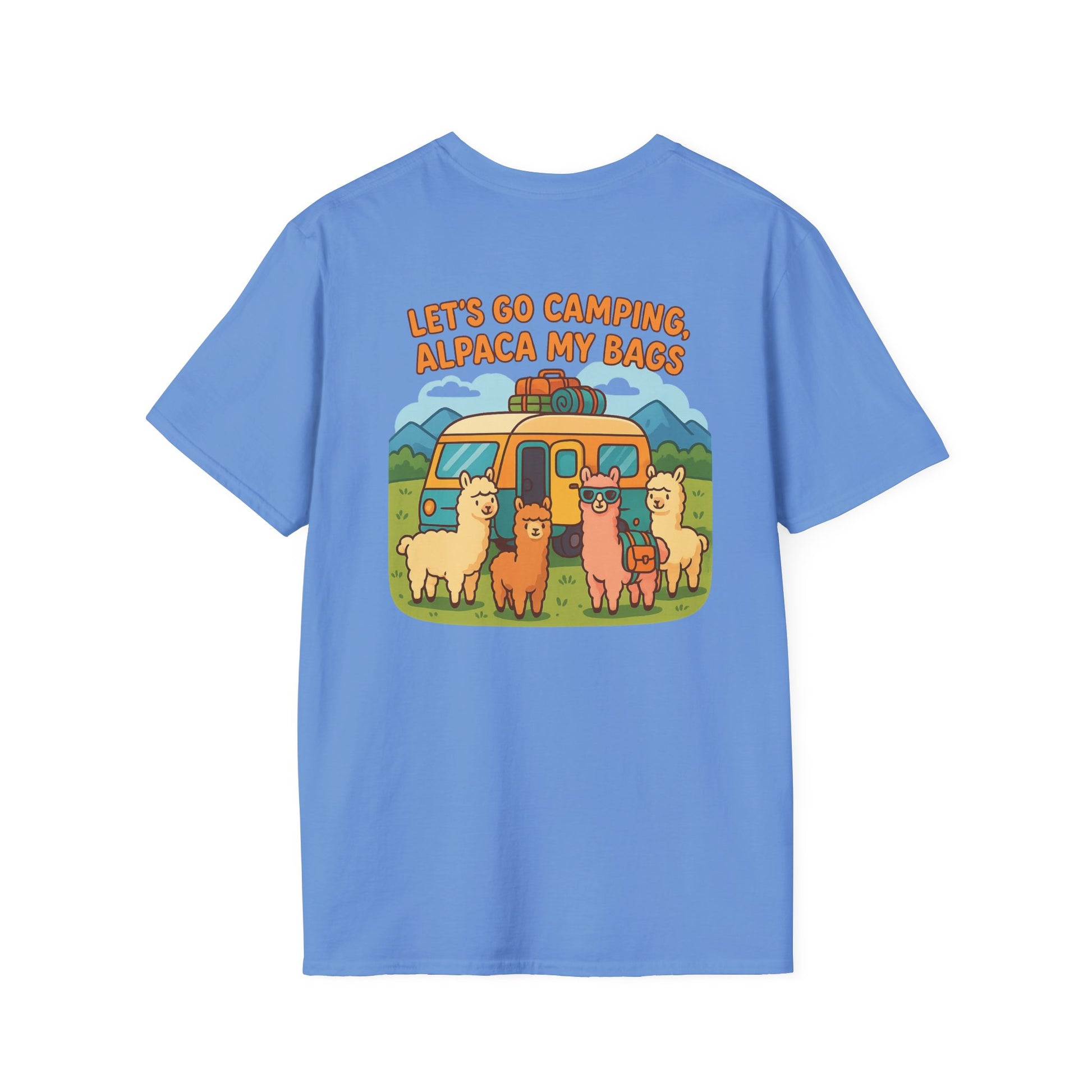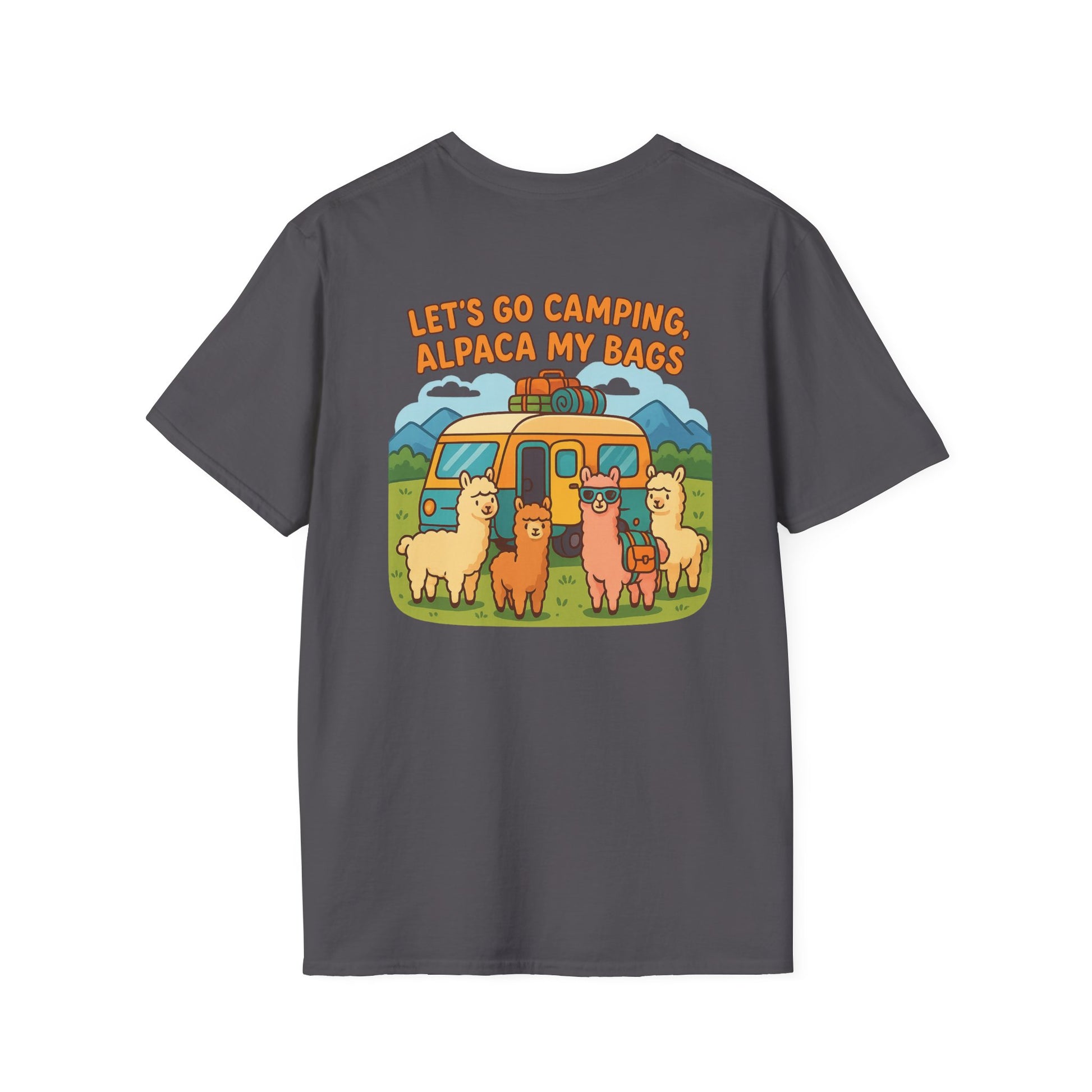 Featuring an adorable crew of alpacas hanging out in front of a classic travel trailer with the wonderfully punny declaration "Let's Go Camping, Alpaca My Bags", this shirt is your ticket to instant campground celebrity status. It's feel-good humor that spreads faster than s'mores gossip around the fire pit.