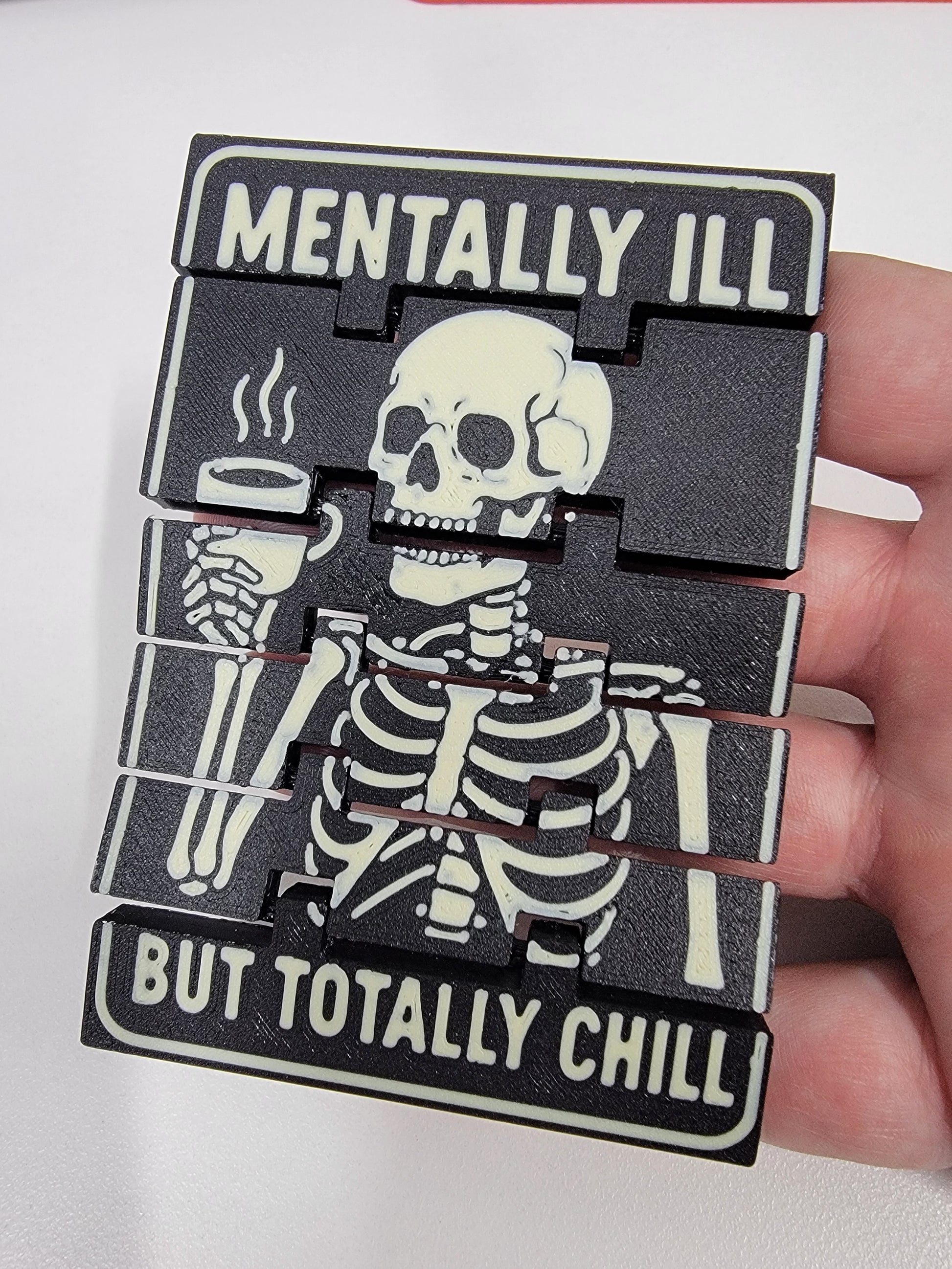 Stay spooky and self-aware with our “Mentally Ill But Totally Chill” Flexi Fidget — a one-of-a-kind conversation piece that wiggles, jiggles, and quietly judges alongside you.