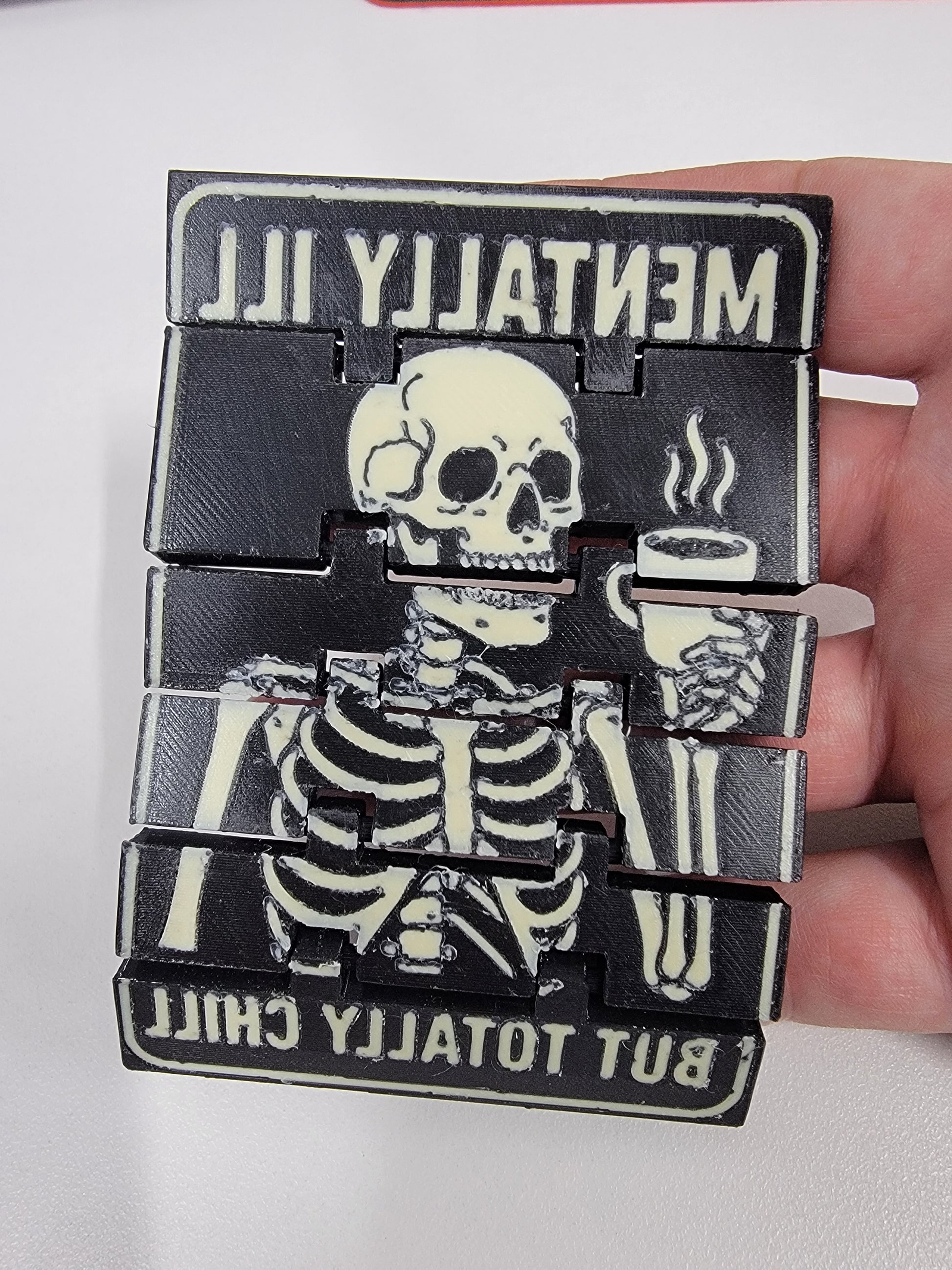 This custom-designed skeleton sipping coffee knows exactly how you feel and isn’t afraid to show it. 3D printed in-house at our shop in Kansas City using high-quality, durable PETG filament, this flexi toy is perfect for fidgeting, stress relief, or just proudly displaying your unhinged serenity.