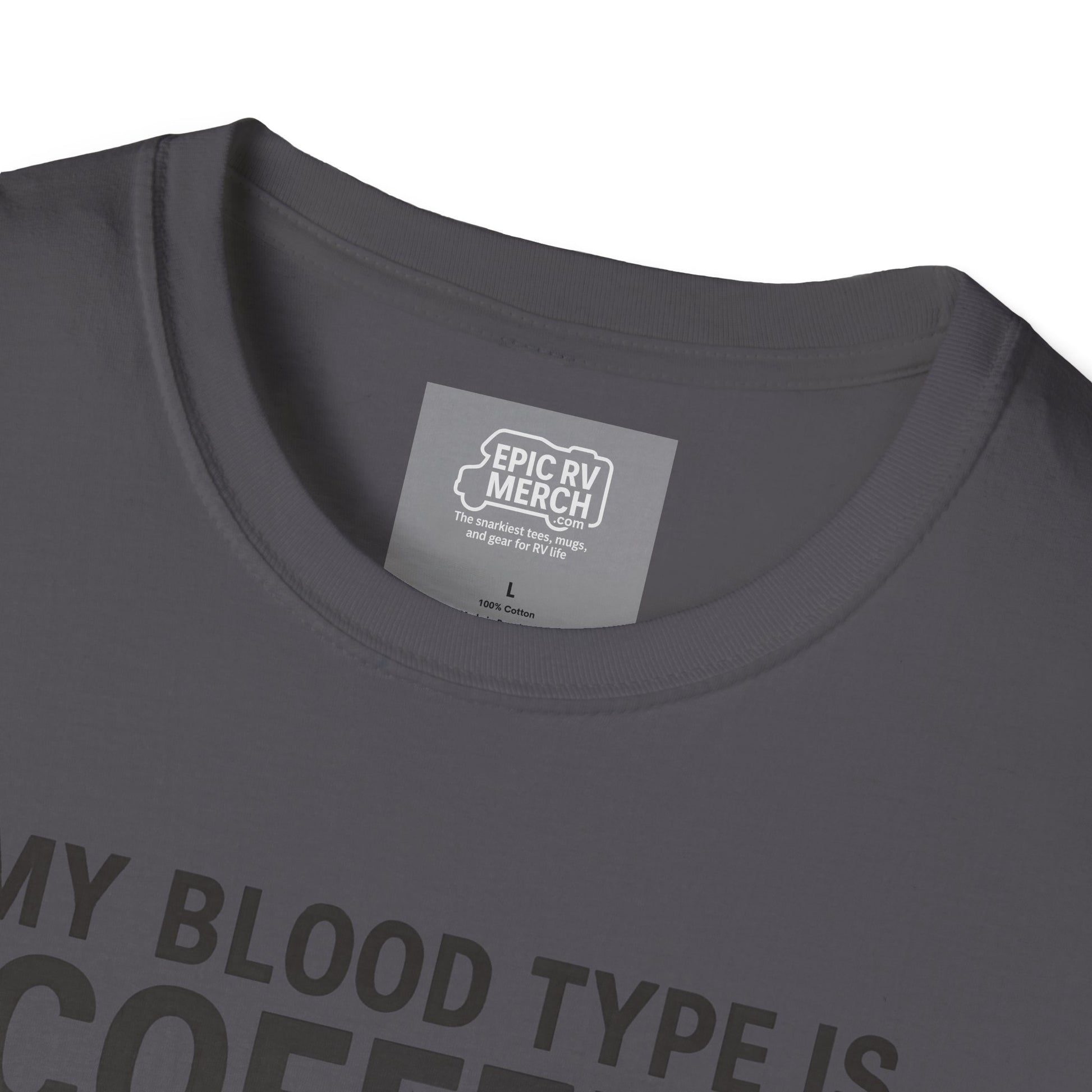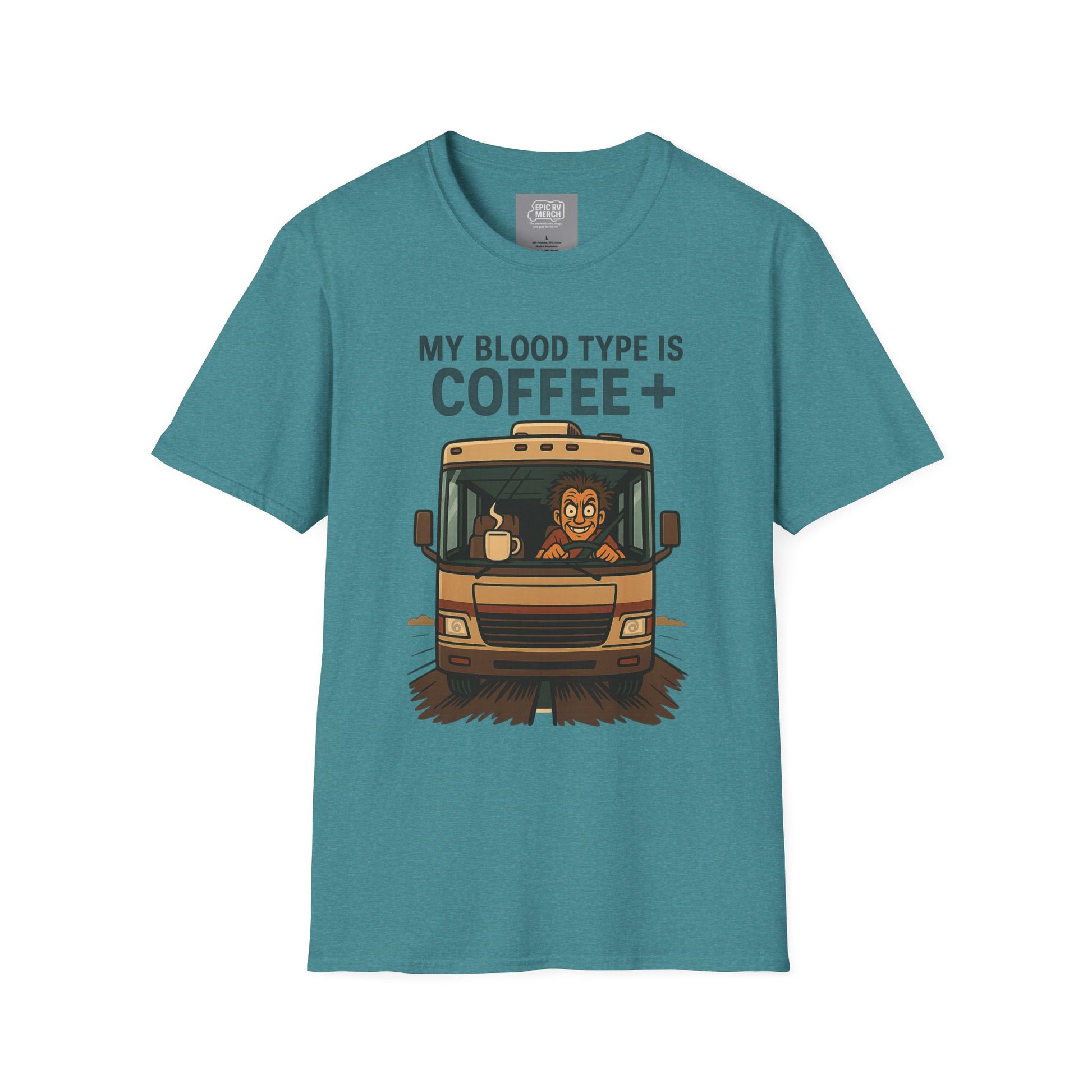 For the RVer who's discovered that piloting 40 feet of house-on-wheels requires industrial-strength caffeine and possibly a slight case of beautiful insanity, we present: the My Blood Type is Coffee+ tee — because that giant travel mug isn't just a beverage, it's essential safety equipment for everyone else on the road.