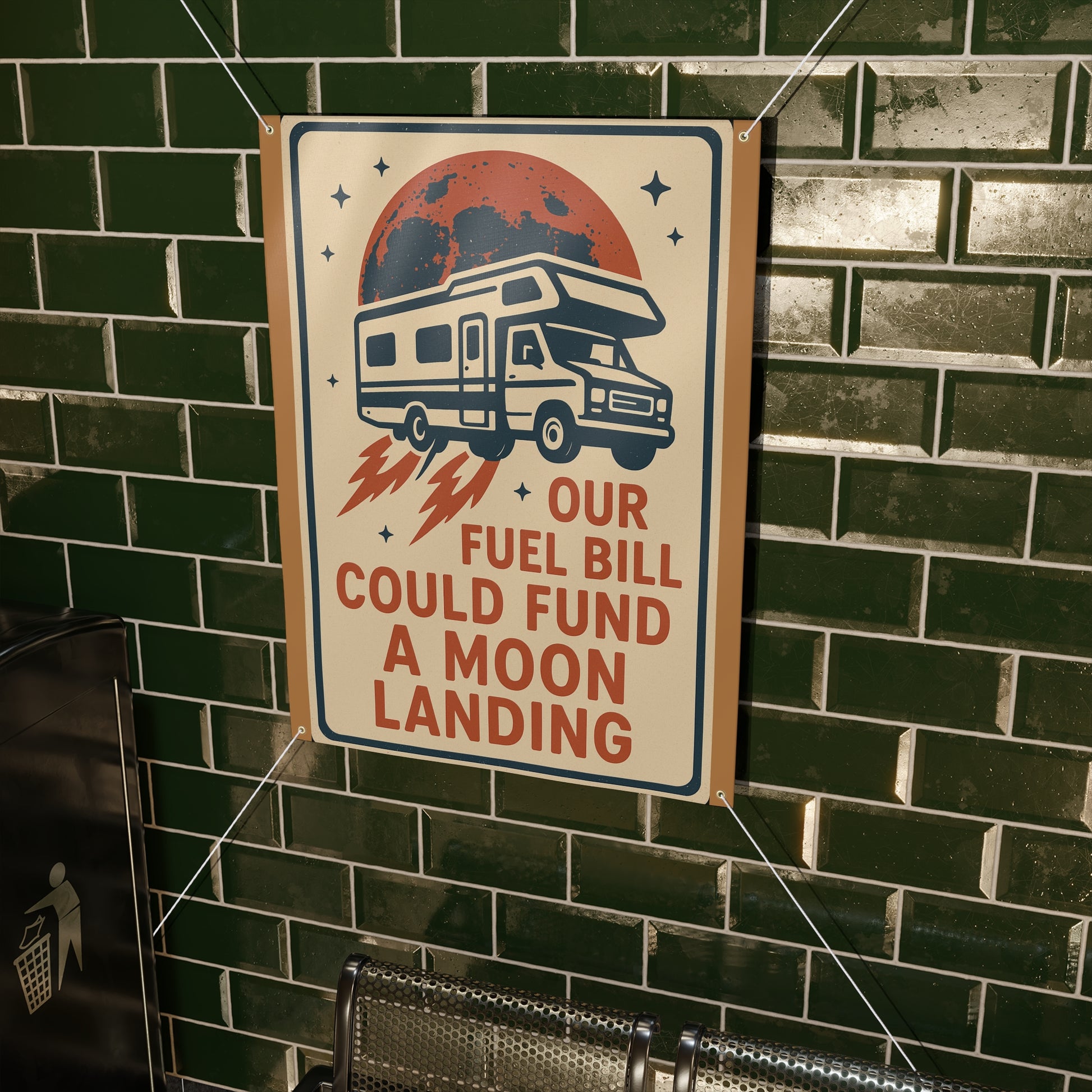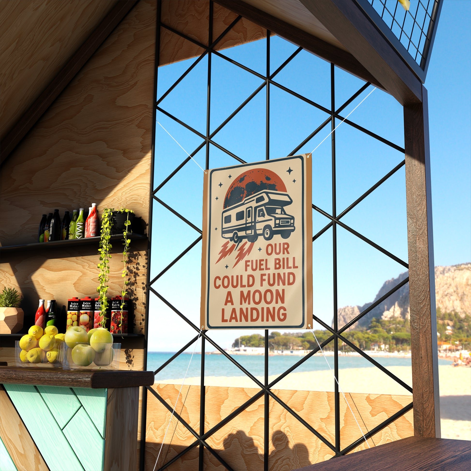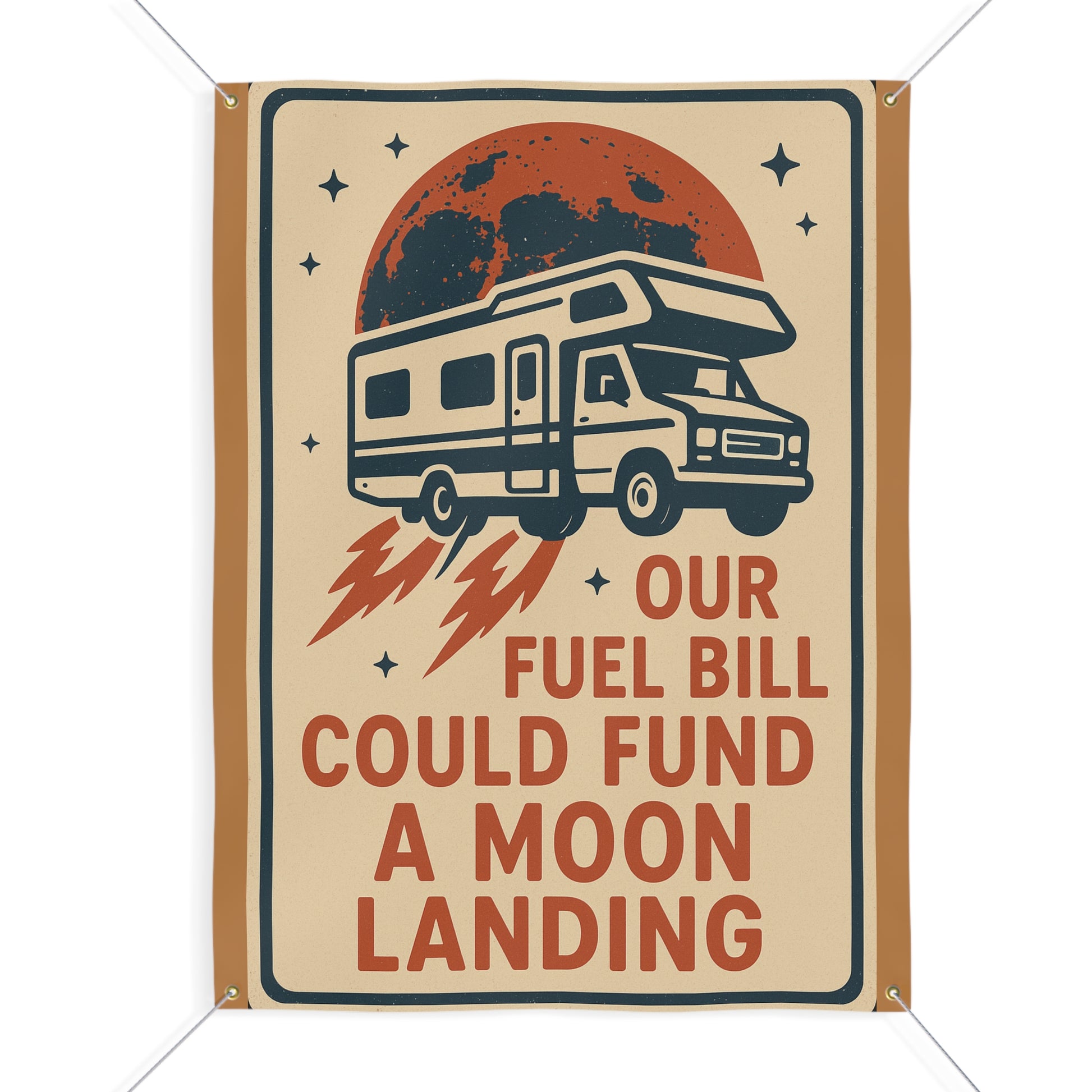 Blast off into brutal honesty with our “Our Fuel Bill Could Fund a Moon Landing” banner. Measuring a glorious 36x48 inches, this vertical RV banner is perfect for campers who know that every trip to the gas station feels like a government-funded aerospace mission. Featuring a bold retro design of a rocket-powered motorhome against a red moon backdrop, this beauty makes your campsite impossible to miss—and impossible to take too seriously.