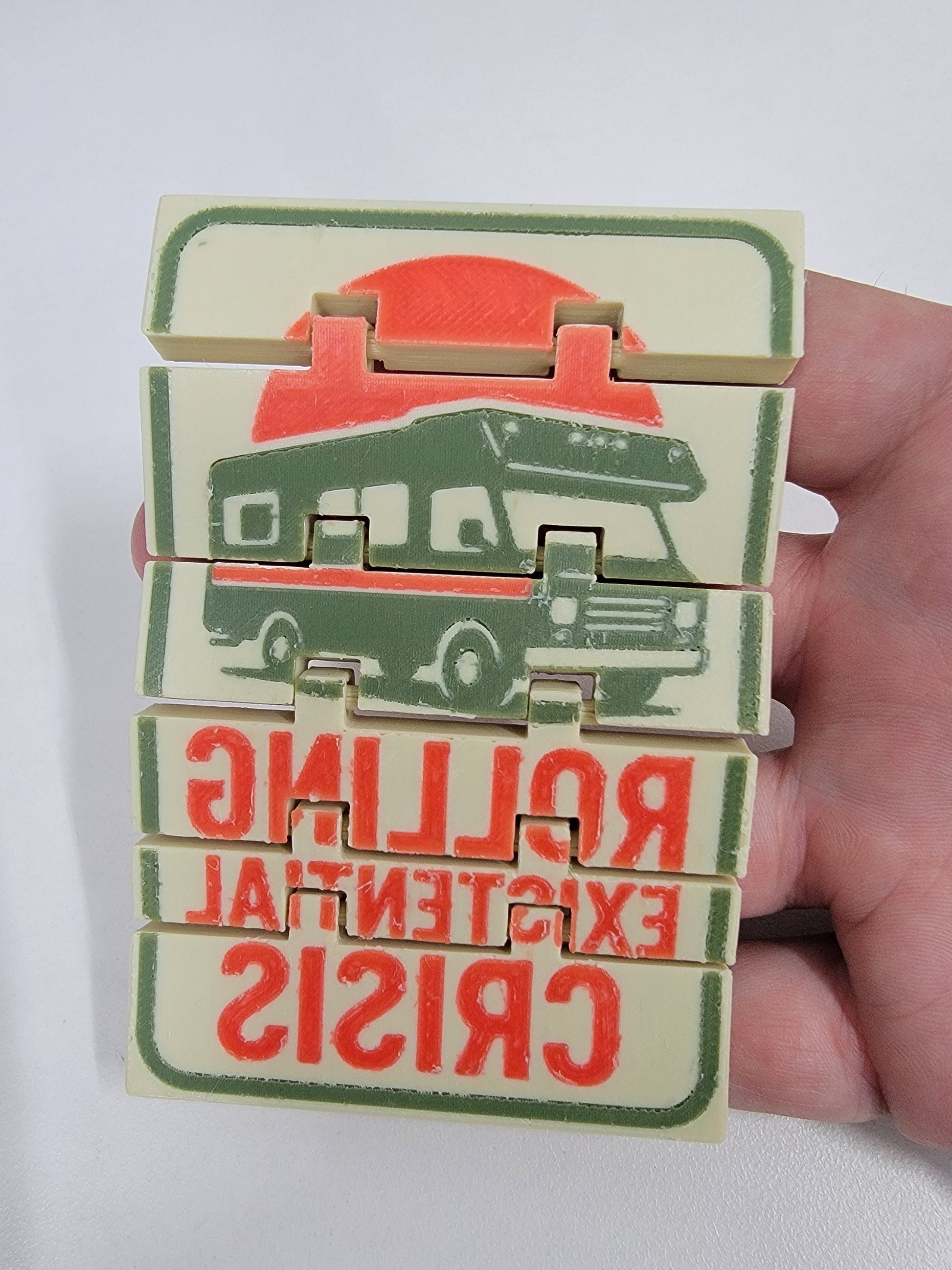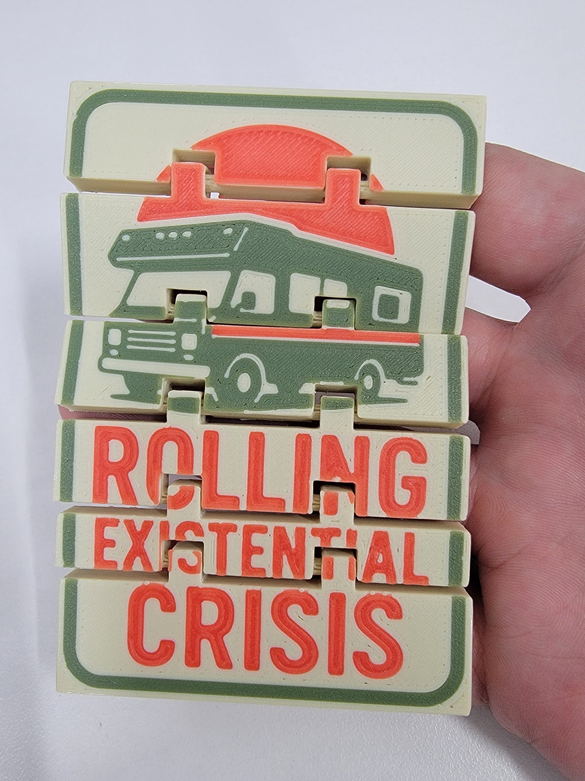 Meet the Rolling Existential Crisis Flexi Fidget: a custom 3D printed RV that flexes, wiggles, and quietly screams inside (just like you on a road trip). Designed and printed in-house at our shop in Kansas City, this fidget toy is the perfect pocket-sized symbol of your mildly chaotic wanderlust.