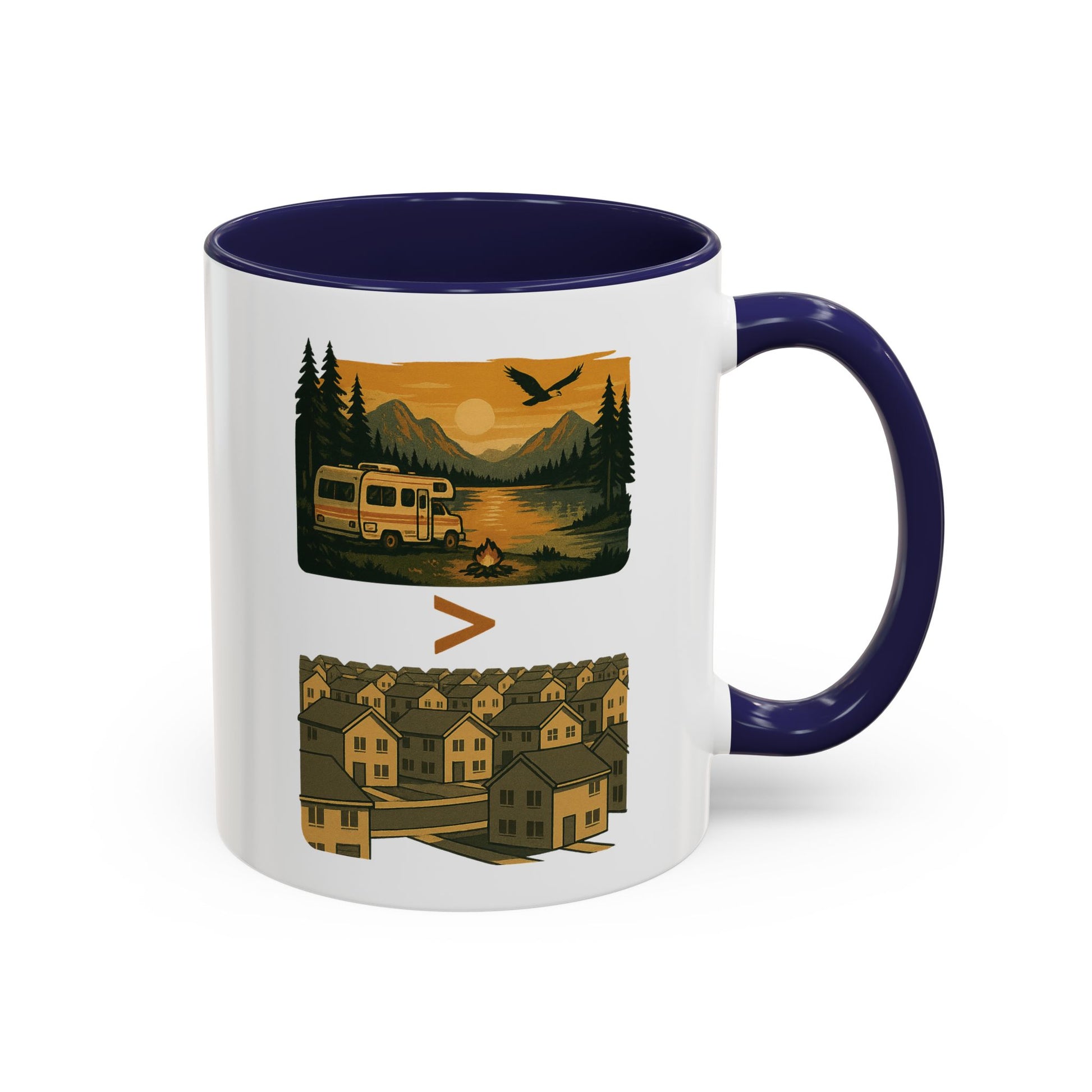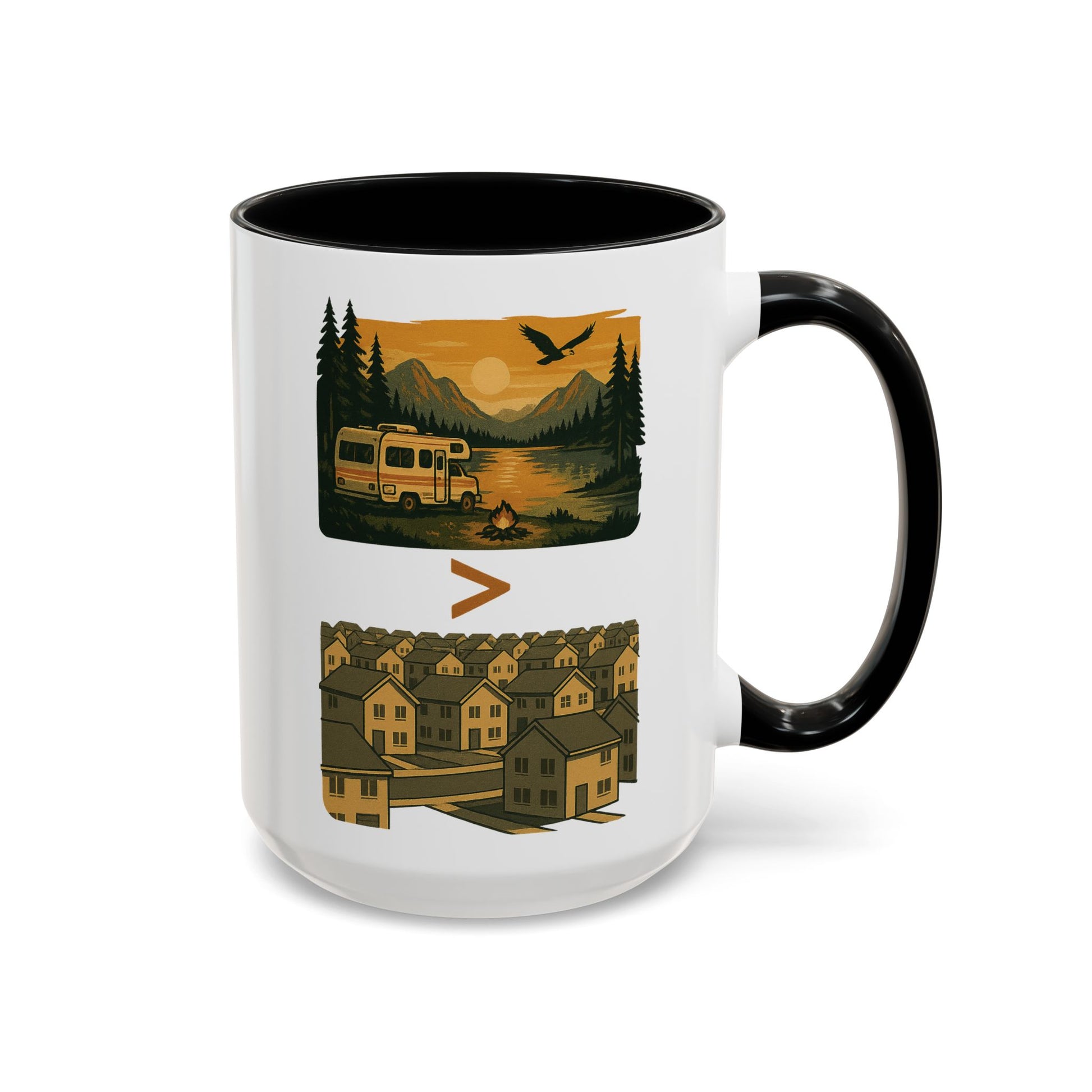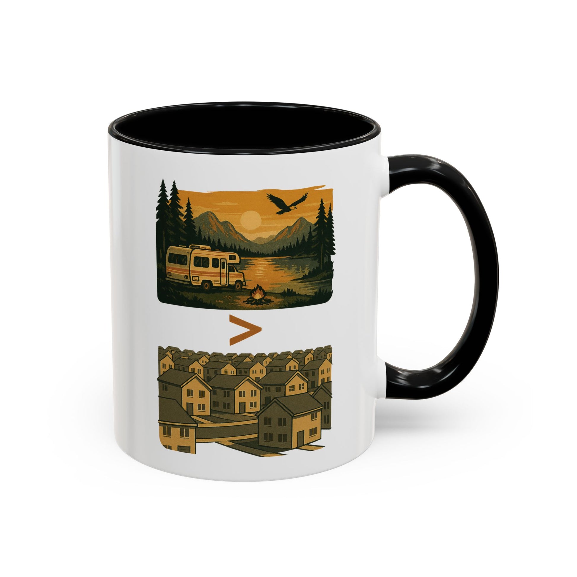 Featuring a bold two-panel design — golden-hour campsite above, cookie-cutter neighborhood below, and a simple “>” doing all the talking — this mug makes a quiet, smug statement every time you sip.