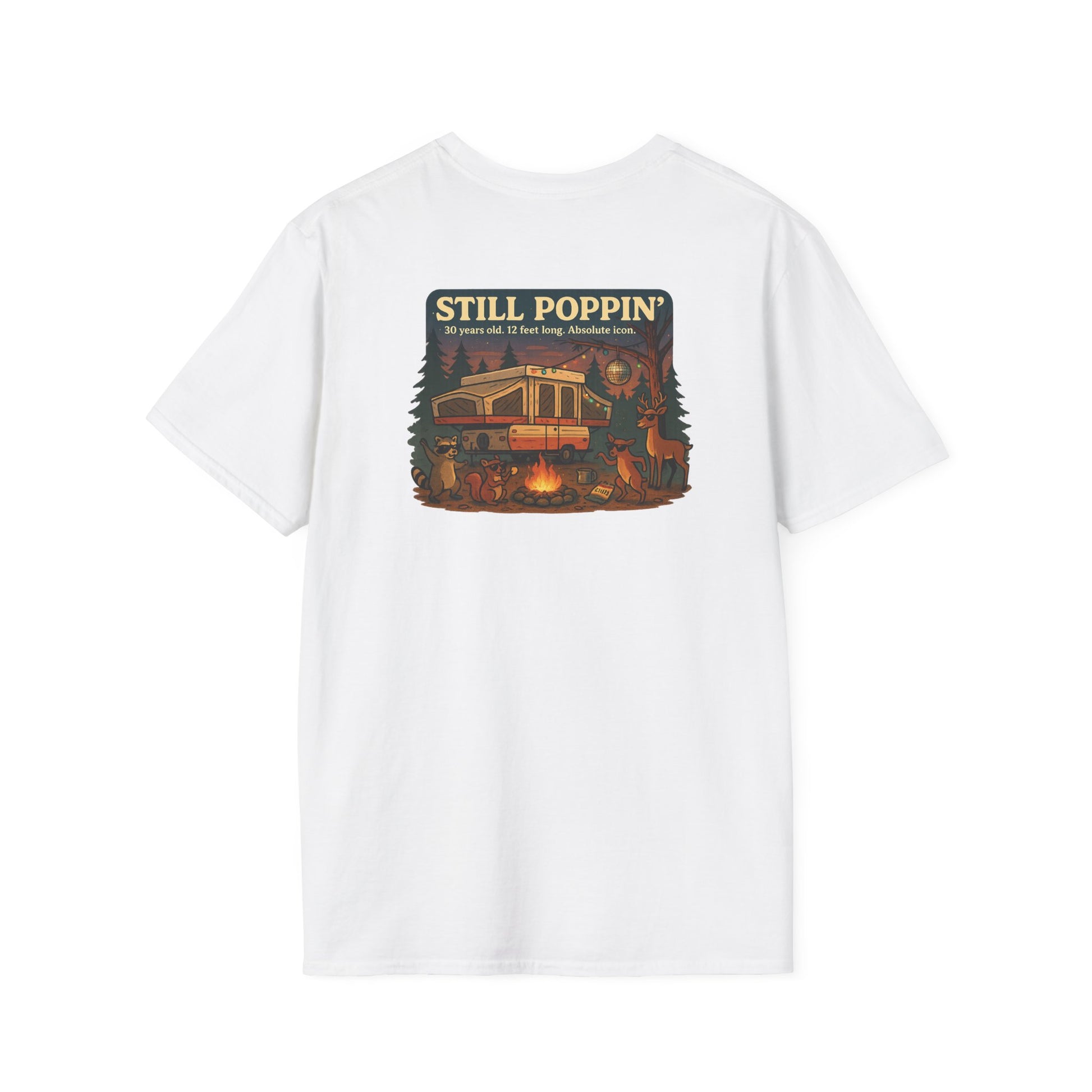 30 years old. 12 feet long. Still the life of the campground. The Still Poppin’ tee is a shoutout to the pop-up campers that refuse to quit—and the folks who proudly tow them anyway. Whether your canvas walls flap like a haunted house or your crank system has “character,” you know the glory of keeping it old school.