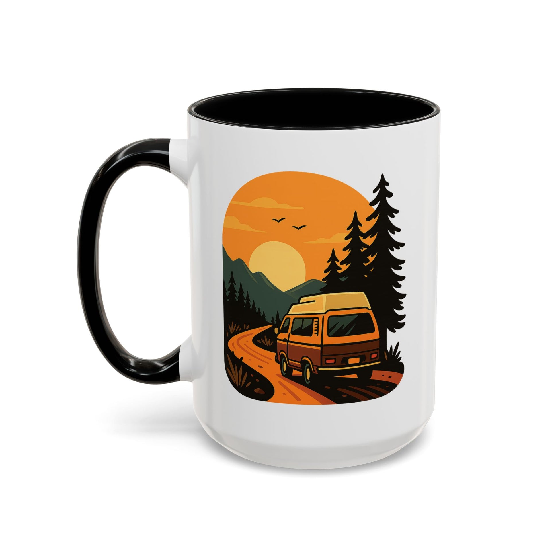 Featuring a classic camper van winding through pine-covered mountains at sunset, it's the visual representation of freedom, adventure, and the open road calling your name.
