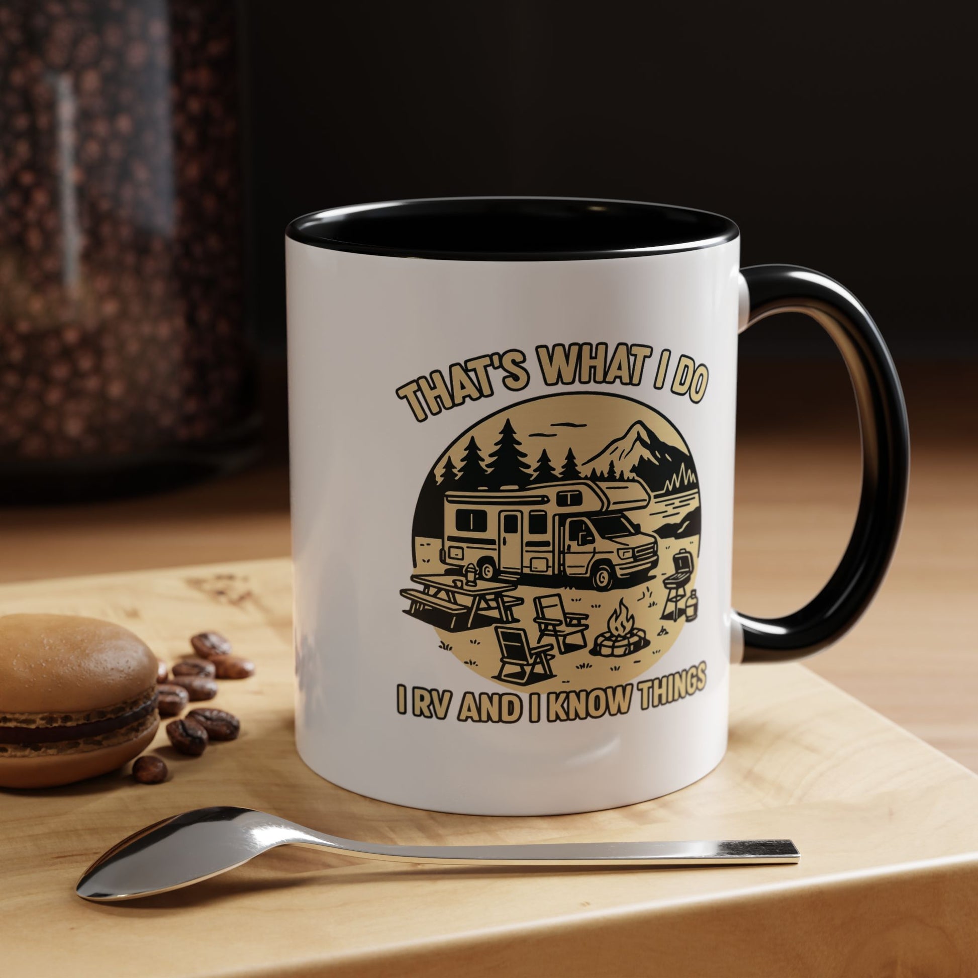 Featuring a classic Class C parked lakeside with mountains in the background and camping gear scattered around like the tools of your trade, this mug celebrates the hard-won knowledge that comes from living the RV life. You don't just camp – you've mastered an entire lifestyle.