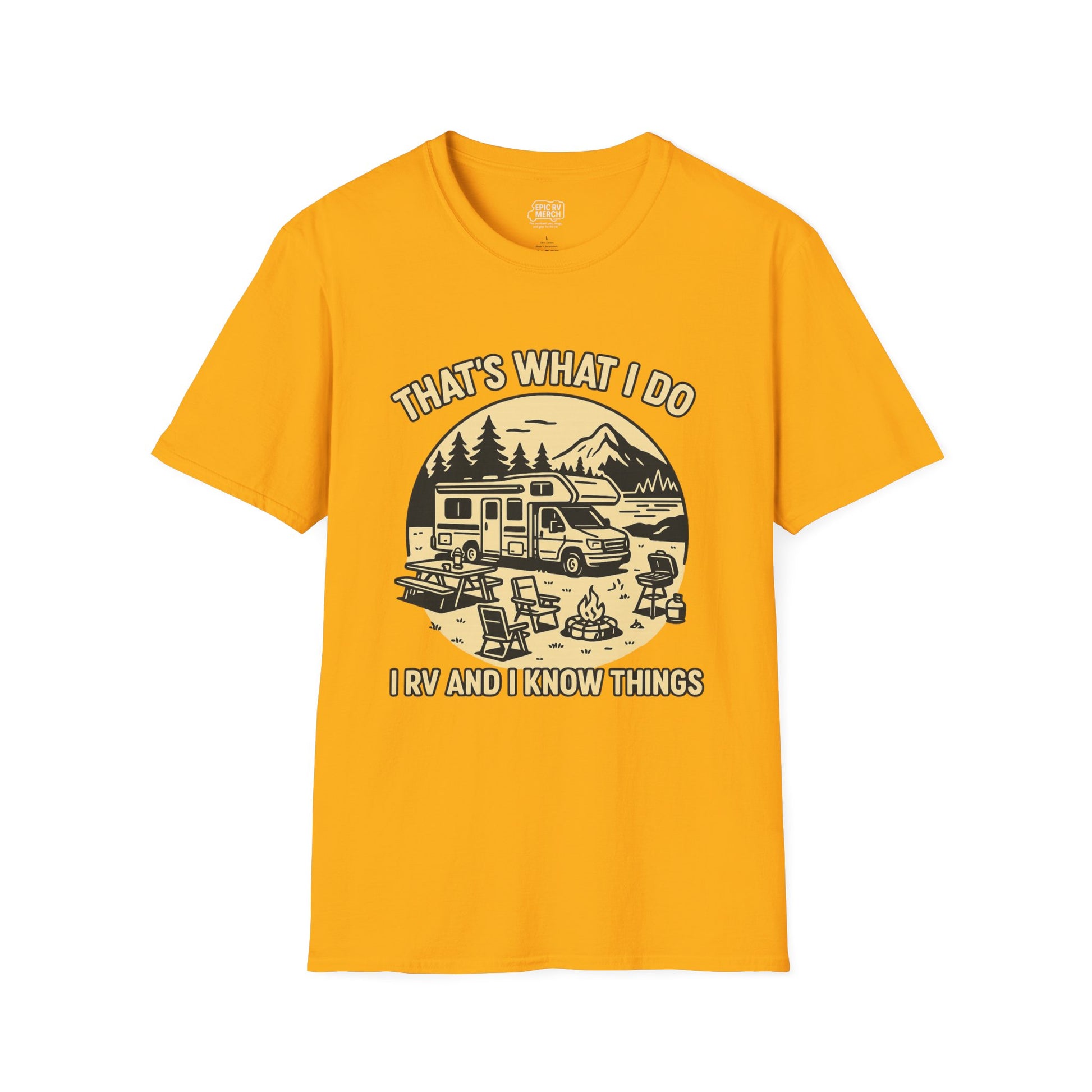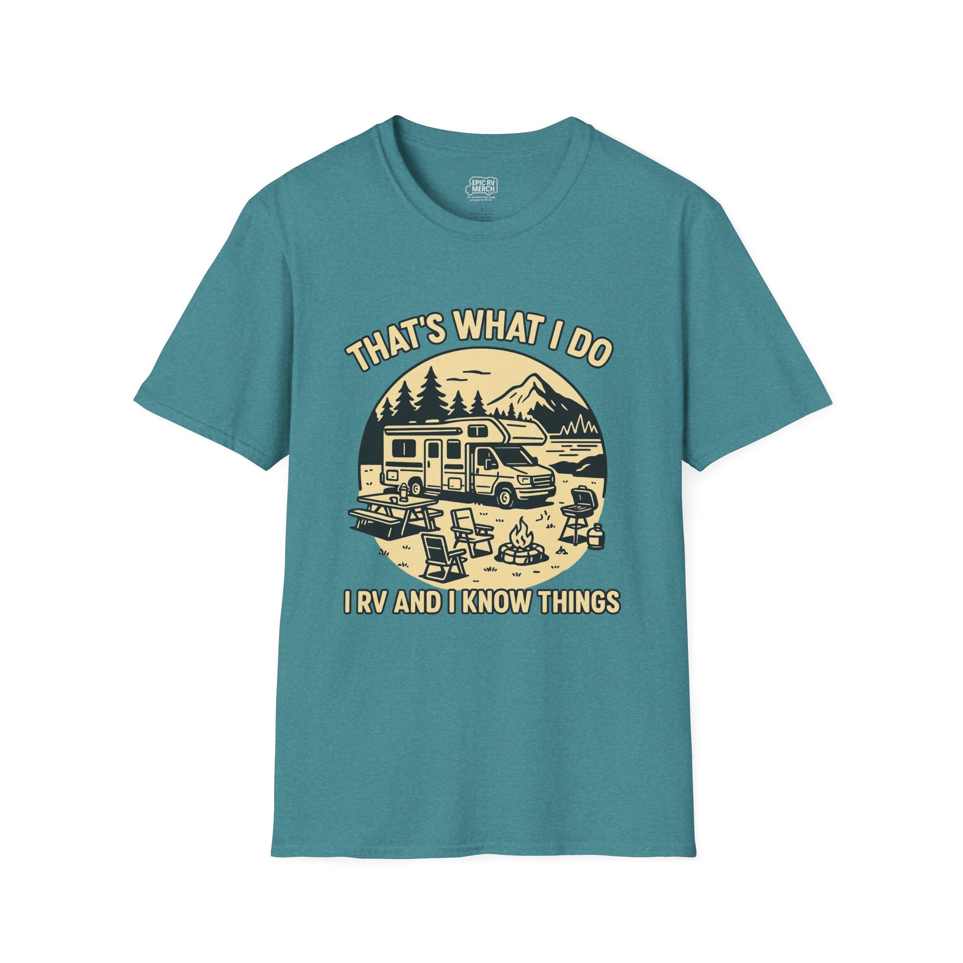 For the seasoned RVer who's accumulated enough road wisdom to basically qualify as a traveling philosopher, we present: the That's What I Do – I RV and I Know Things tee. Because after you've leveled a rig on an unlevel site, fixed a water heater with duct tape, and found the one campsite with cell service, you've earned the right to claim expert status.