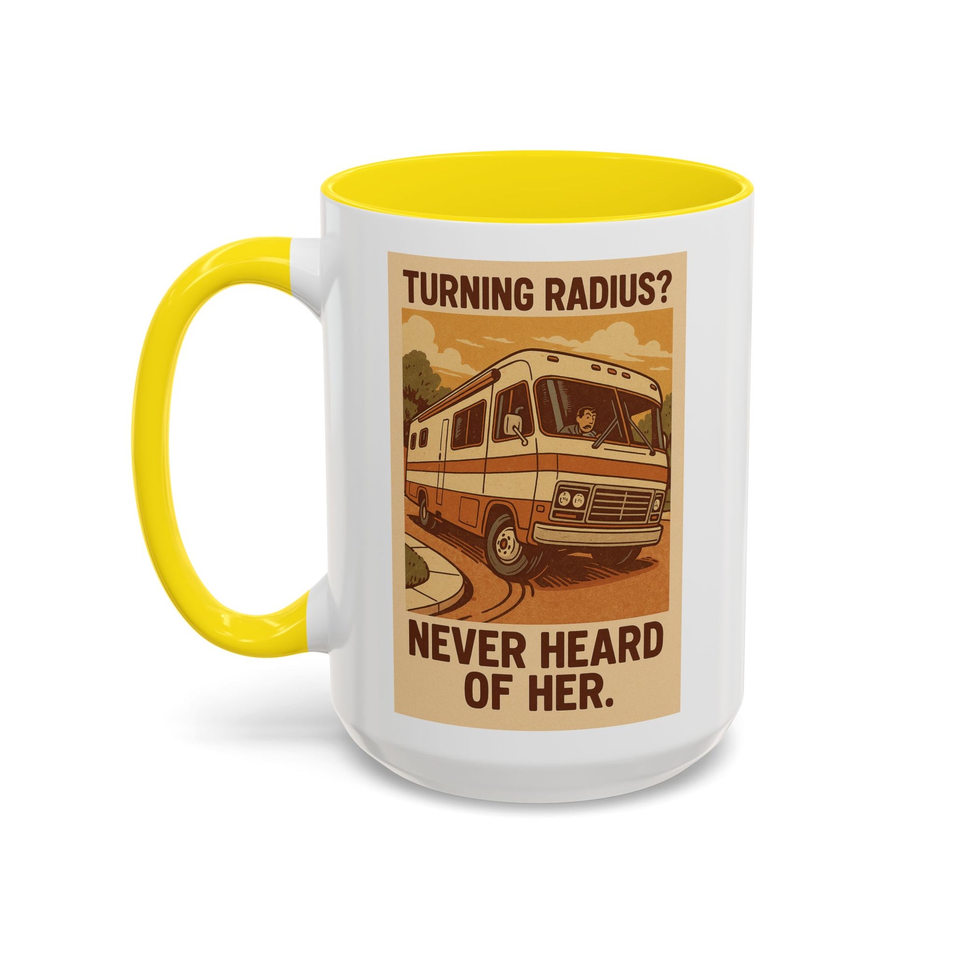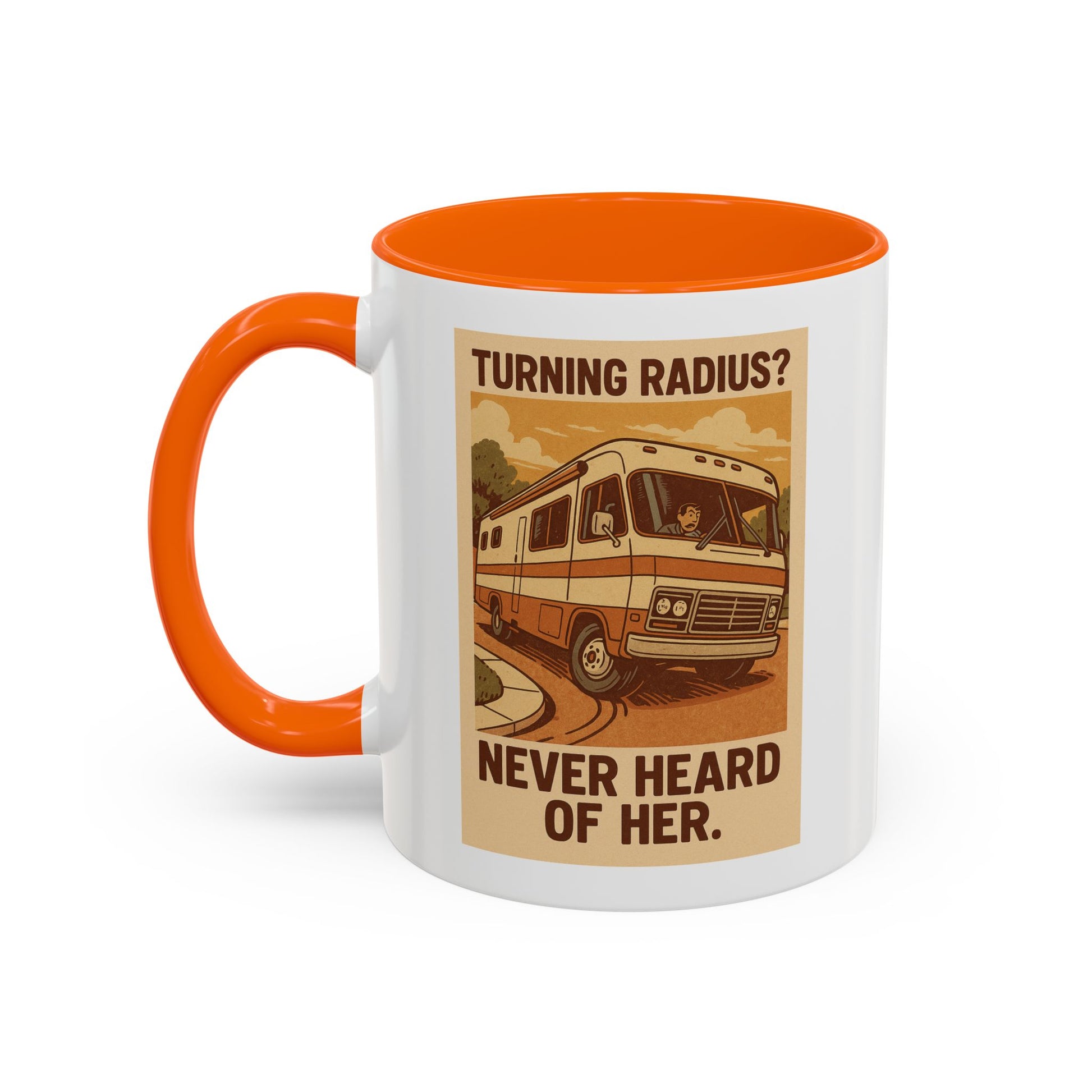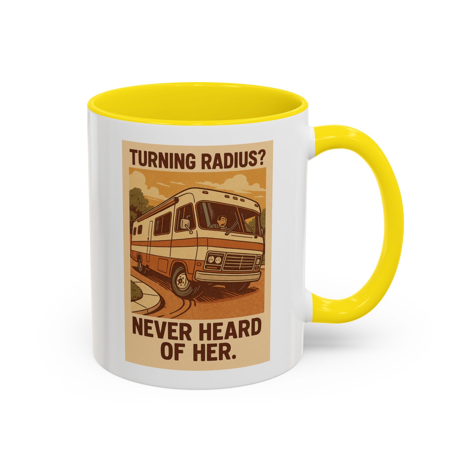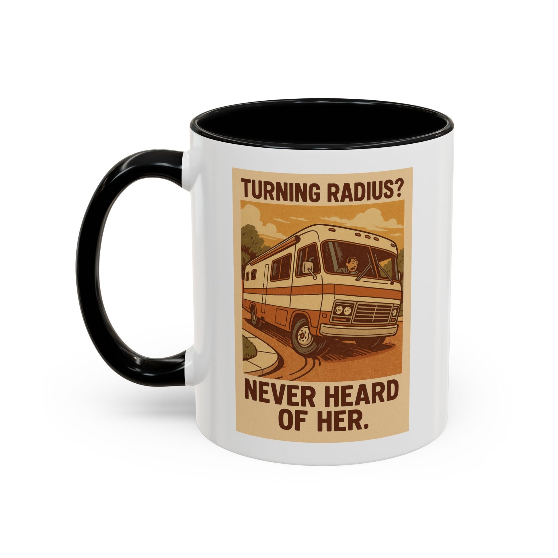 For the fearless road warriors piloting 40 feet of fiberglass and prayer, this mug is your new co-pilot. Featuring a vintage Class A motorhome and the iconic phrase "Turning Radius? Never Heard of Her," it's the perfect tribute to wide turns, narrow roads, and your complete disregard for spatial limitations.