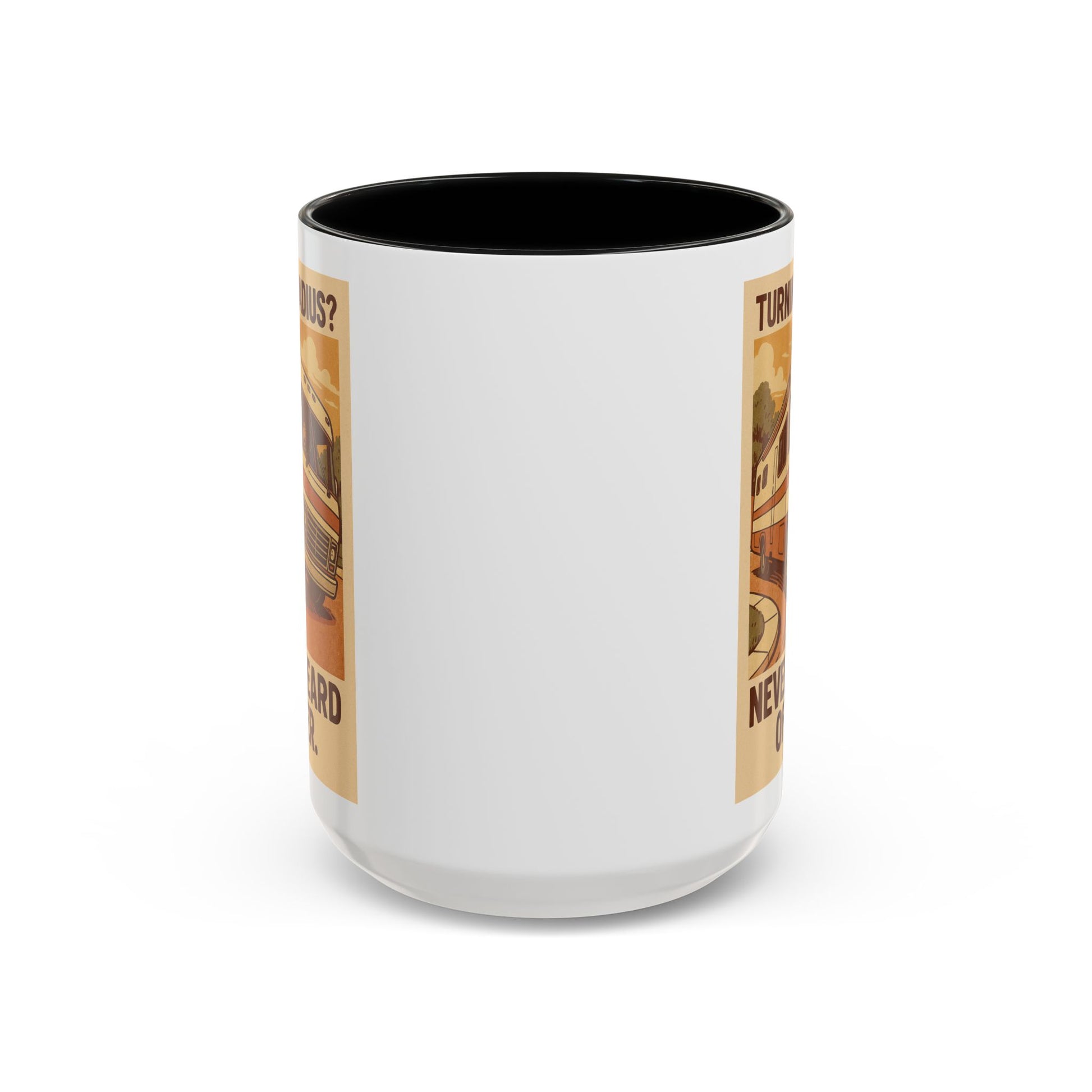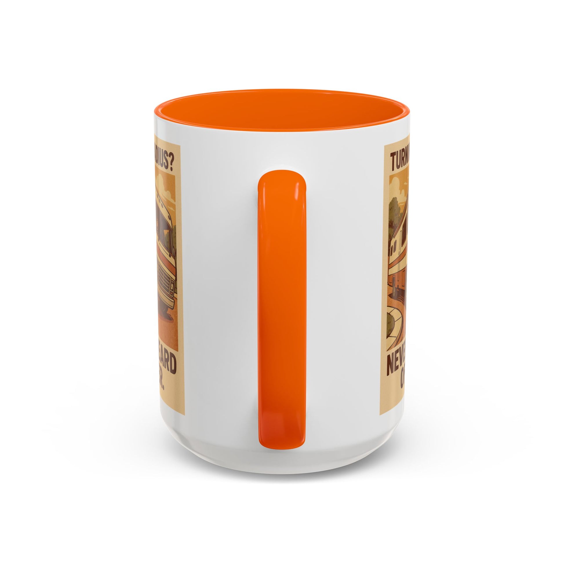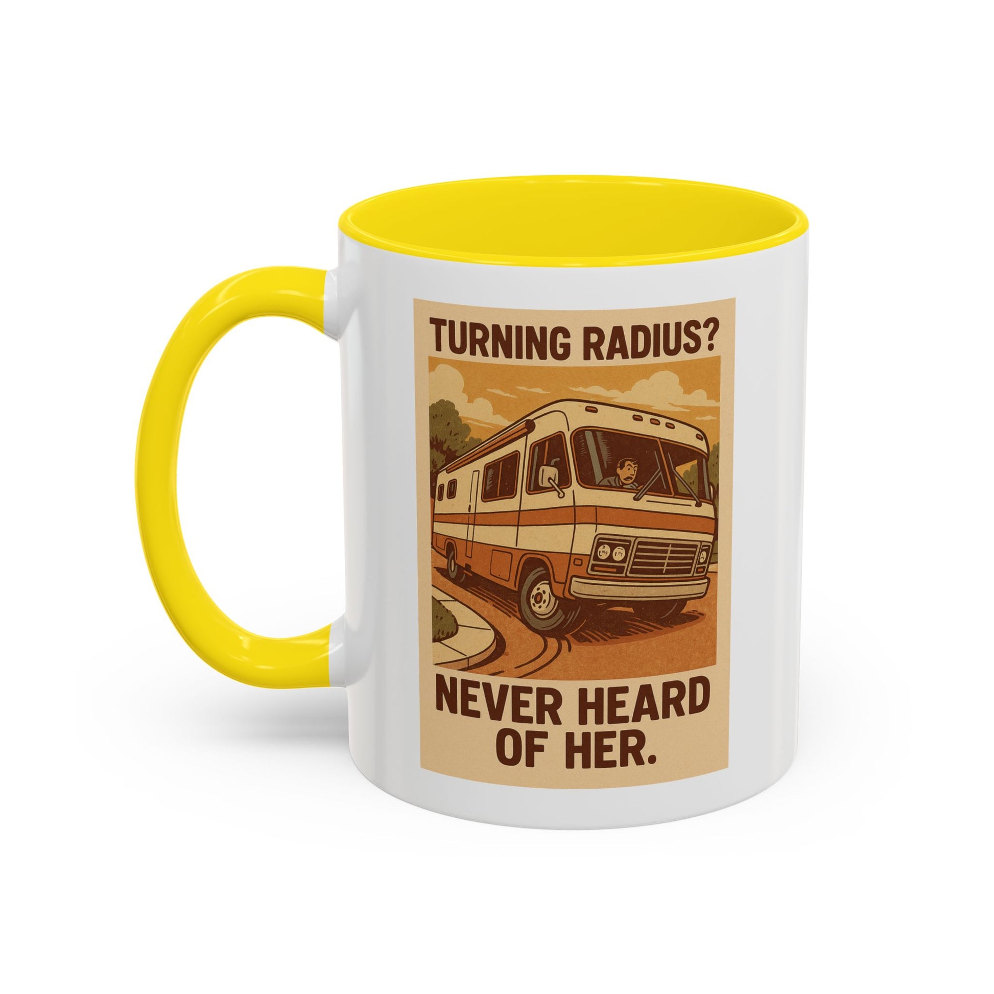 For the fearless road warriors piloting 40 feet of fiberglass and prayer, this mug is your new co-pilot. Featuring a vintage Class A motorhome and the iconic phrase "Turning Radius? Never Heard of Her," it's the perfect tribute to wide turns, narrow roads, and your complete disregard for spatial limitations.