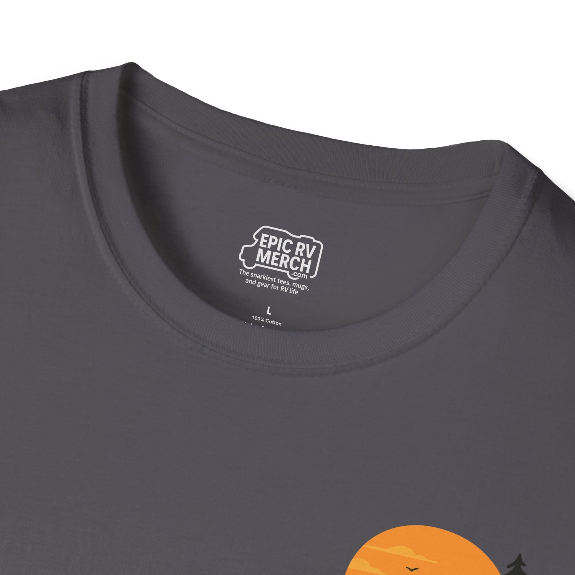 Featuring a classic VW Westfalia-style van parked lakeside at golden hour with its pop-top open and adventure gear ready, this shirt celebrates choosing freedom over square footage and sunrise over schedules. It's for people who realized life's too short to spend it indoors when there's a whole world to explore.