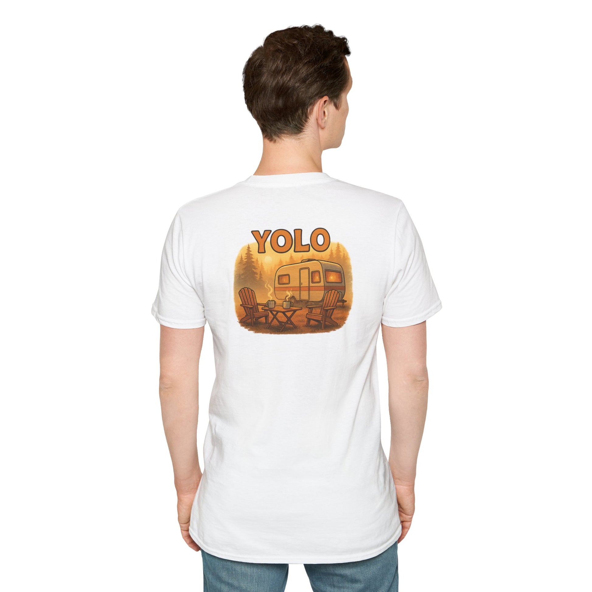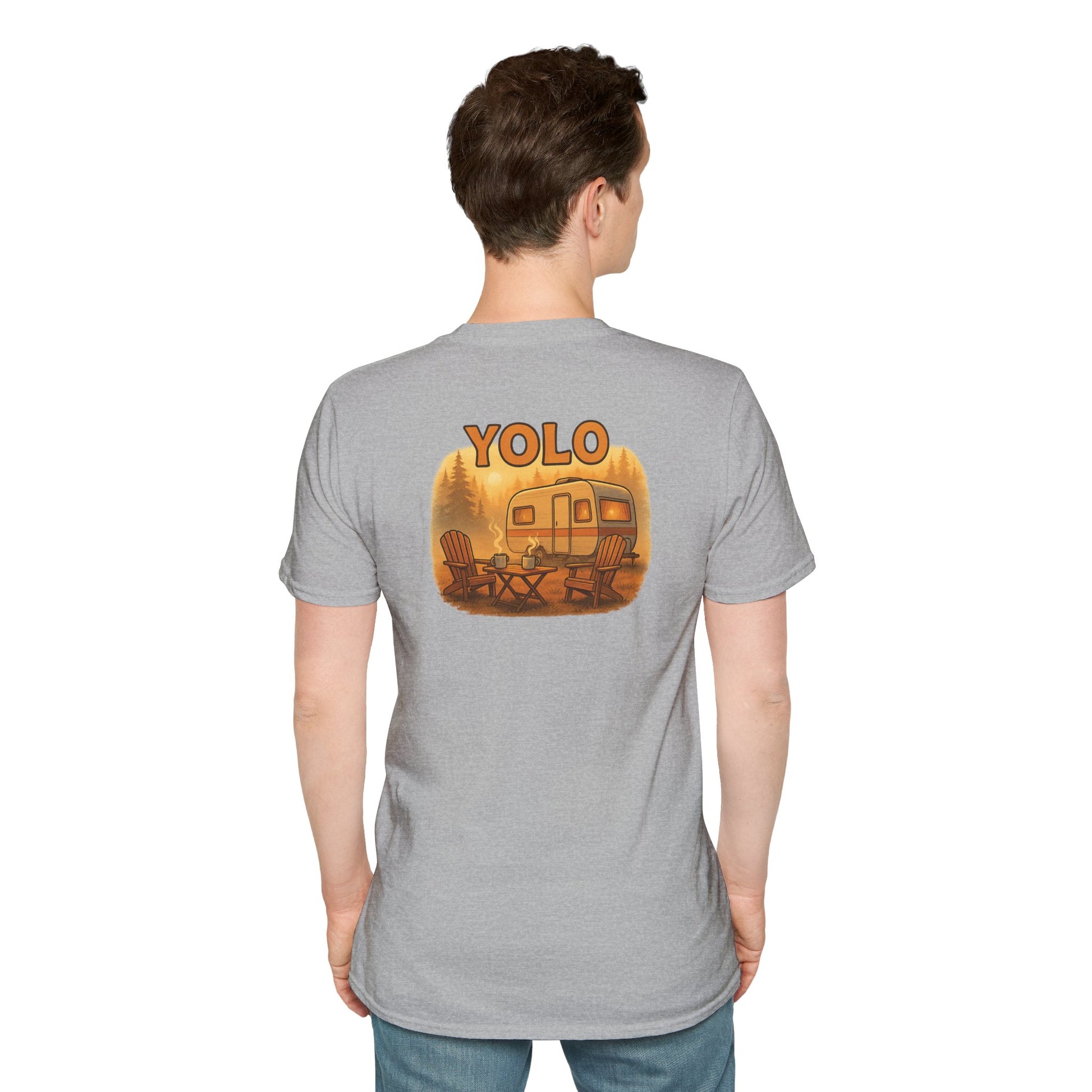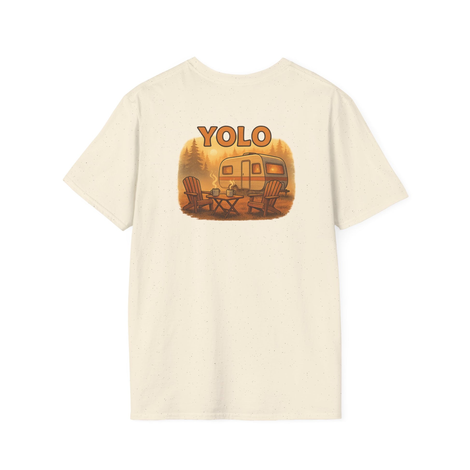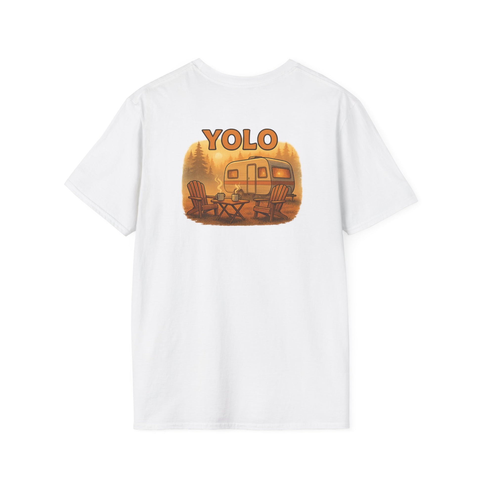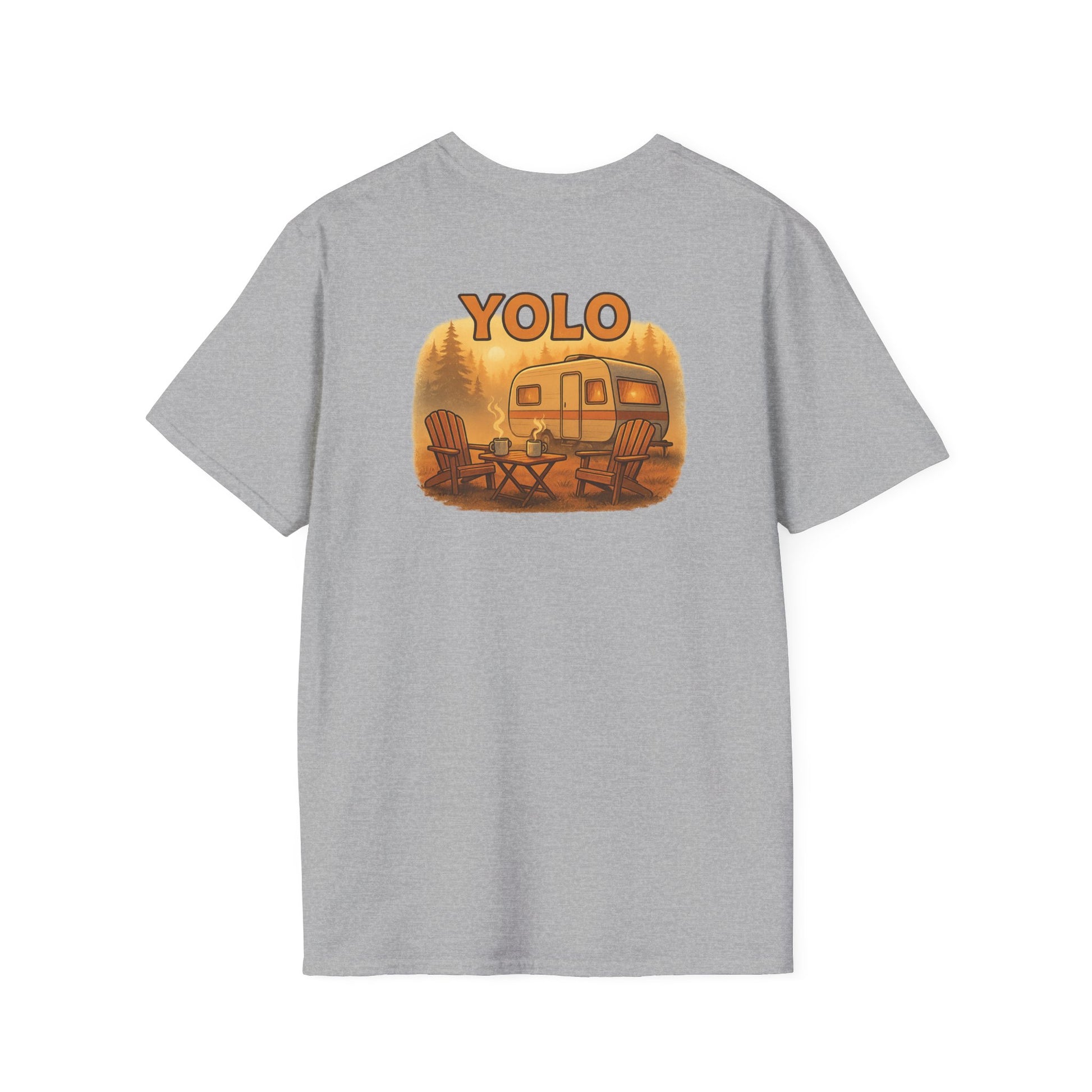 On the back, the bold YOLO lettering hovers over a perfectly chill campsite scene—because who needs a midlife crisis when you have hookups and a view? On the front? A classic RV Park sign logo, understated but knowing, for those who live (and lounge) the RV dream.